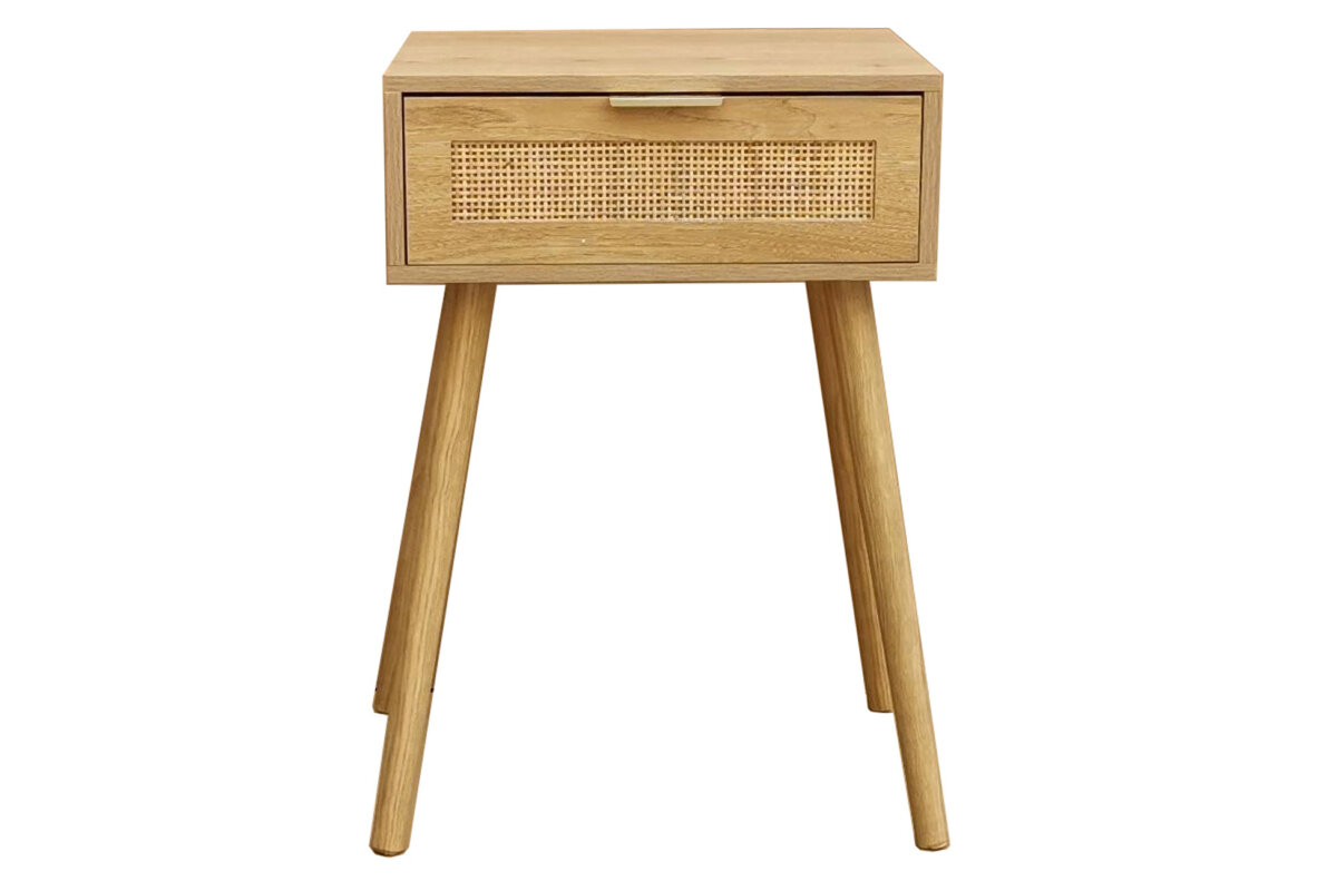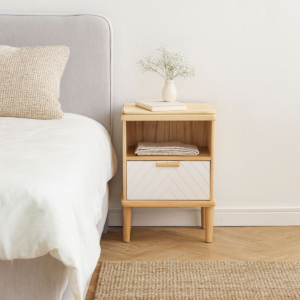 Mesilla de noche con patas nórdicas. | 1 cajón de gran capacidad con frente en rattán. | Papel laminado. | Color pino / rattan. | Medidas: 40 x 30 x 60 cm.