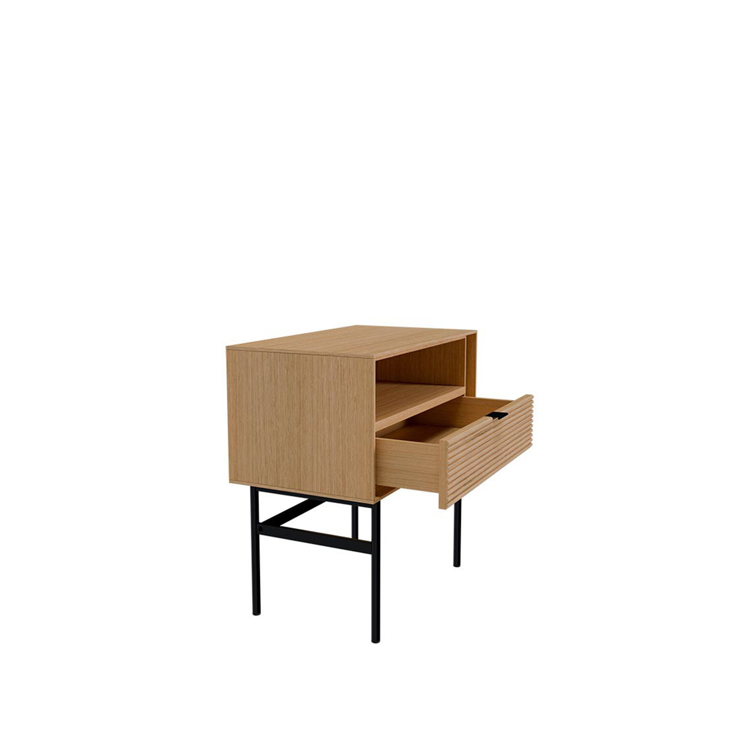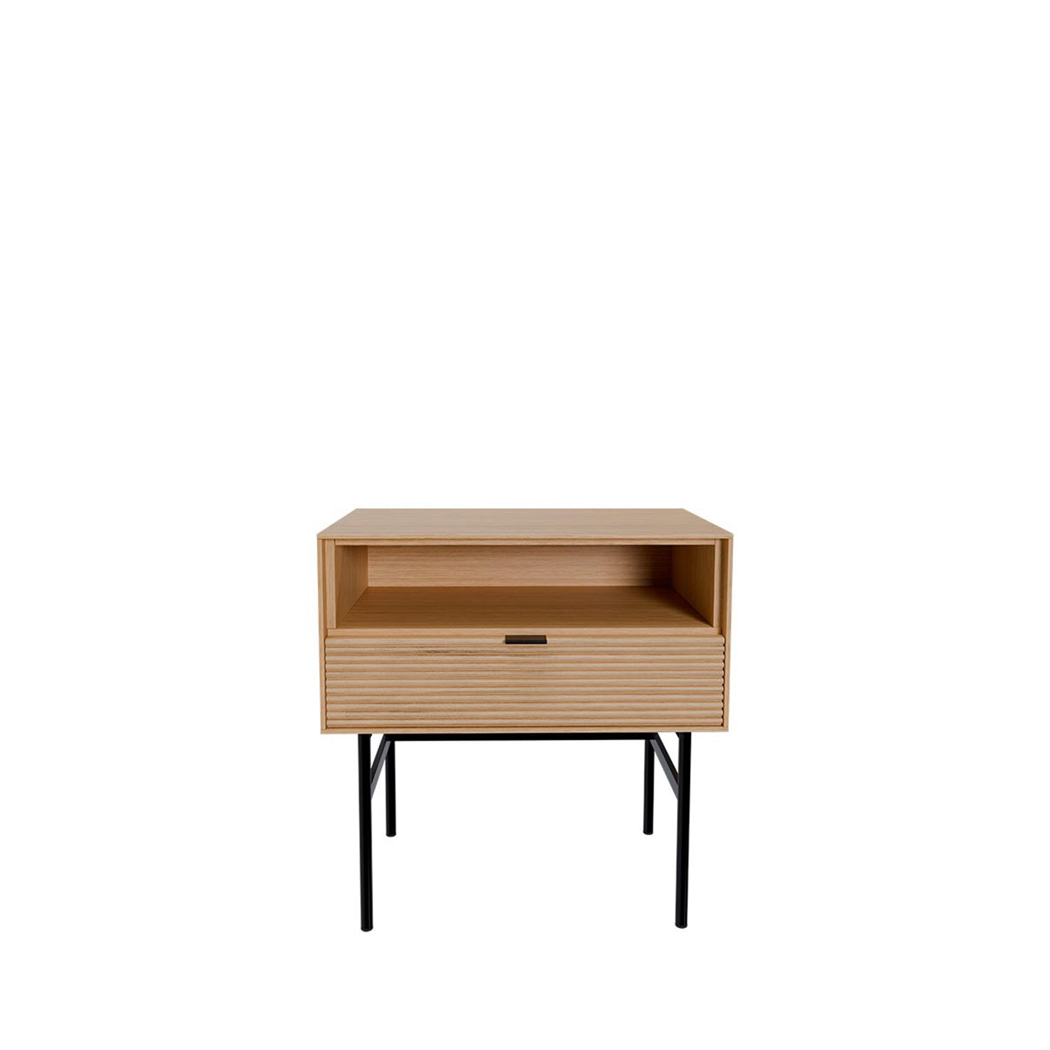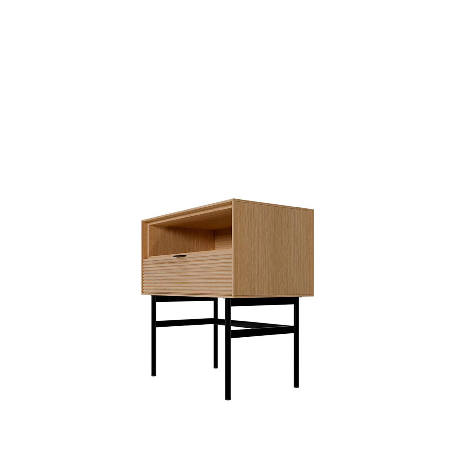La mesita alta TULSA de 60 cm destaca por su diseño sobrio y elegante, ideal como complemento junto a sofás o butacas. Cuenta con un cajón funcional que aporta almacenaje sin recargar el espacio. Su estructura en chapa de roble y el frente en madera maciza rayada ofrecen una textura cálida, mientras que los acabados metálicos en negro y el sistema soft closing completan su carácter contemporáneo.