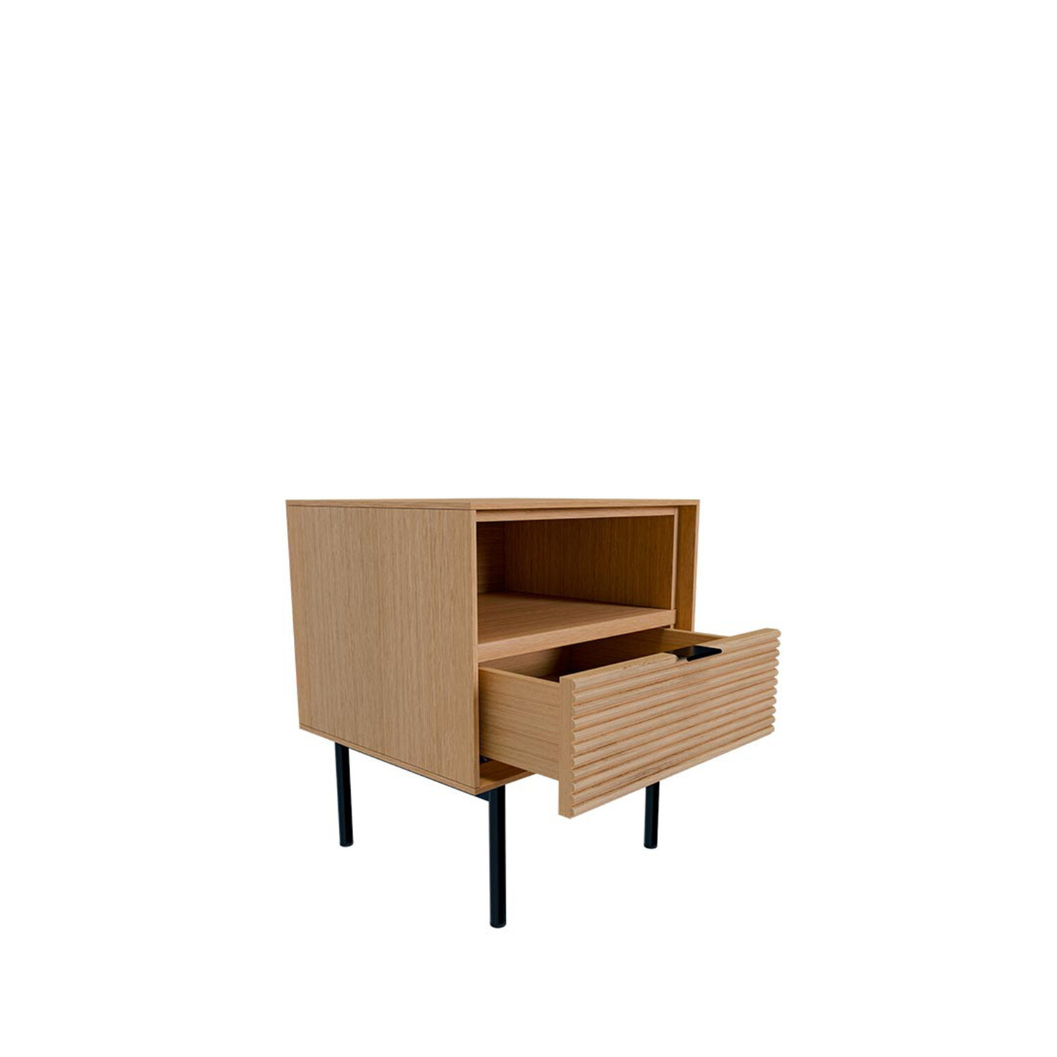 La mesita baja TULSA de 40 cm combina funcionalidad y diseño natural en formato compacto. Con un cajón y un hueco abierto, es perfecta como auxiliar junto al sofá o en el dormitorio. Su estructura en chapa de roble y el frente en madera maciza rayada aportan textura y calidez, mientras que los detalles metálicos en negro y el sistema soft closing completan su estilo contemporáneo.