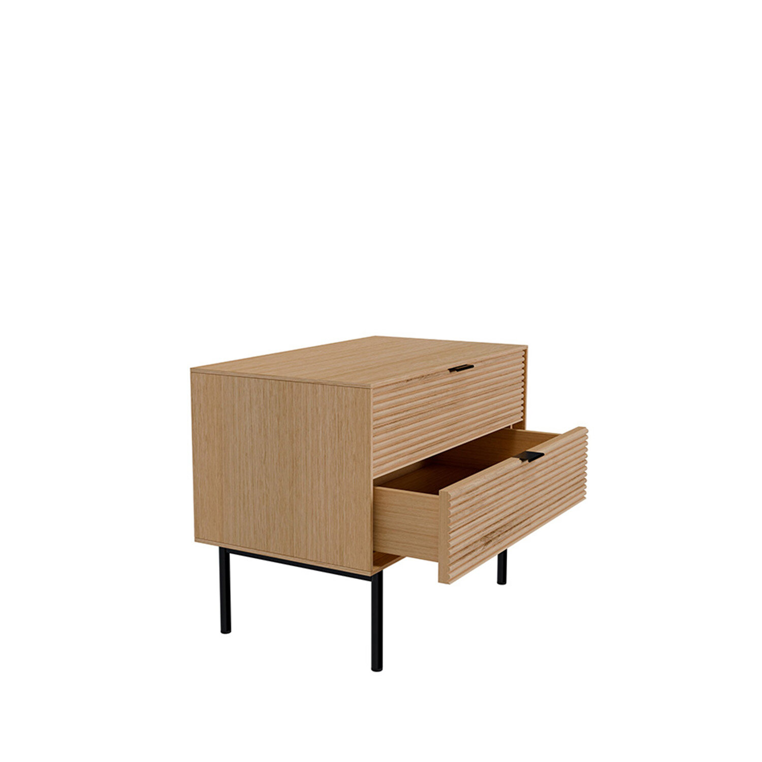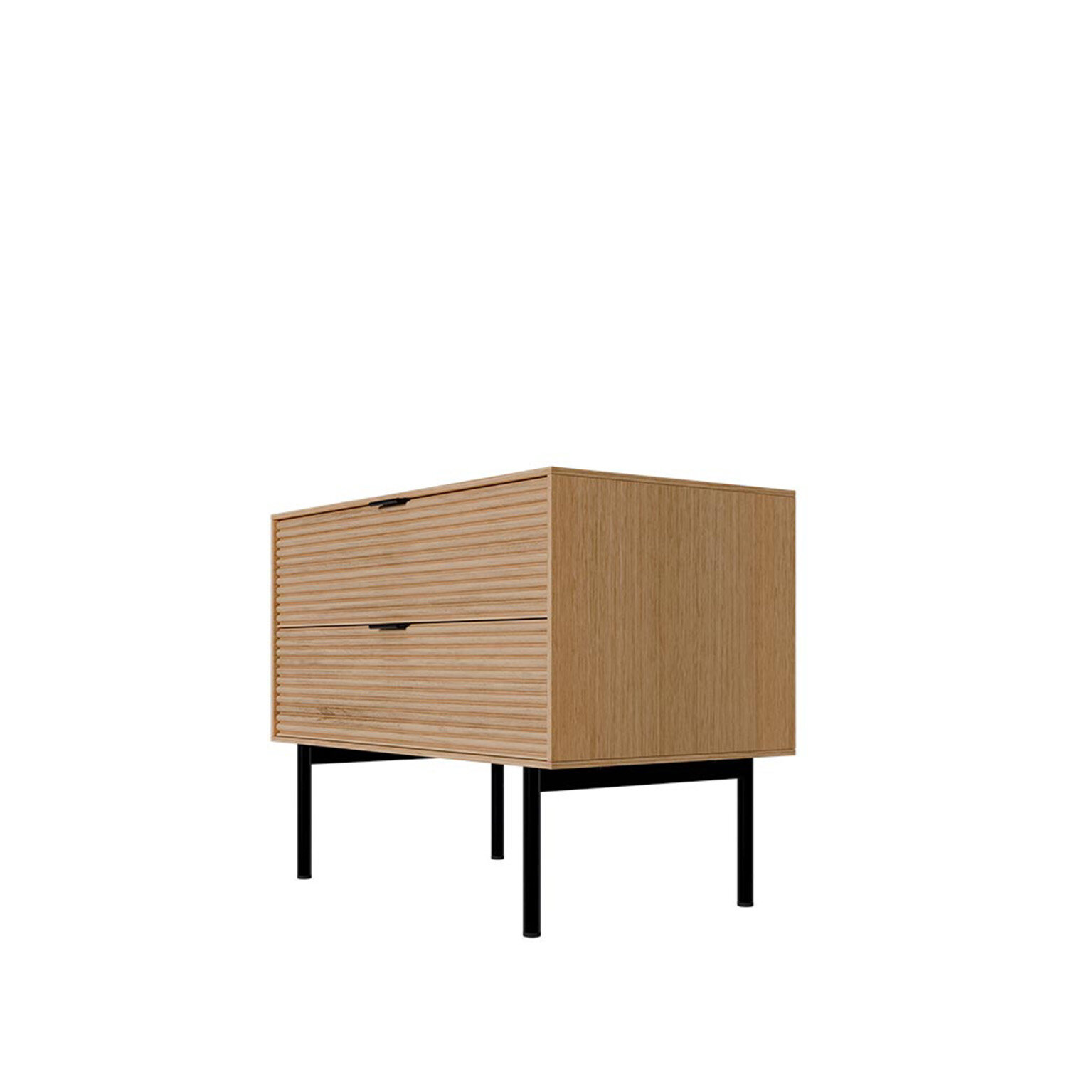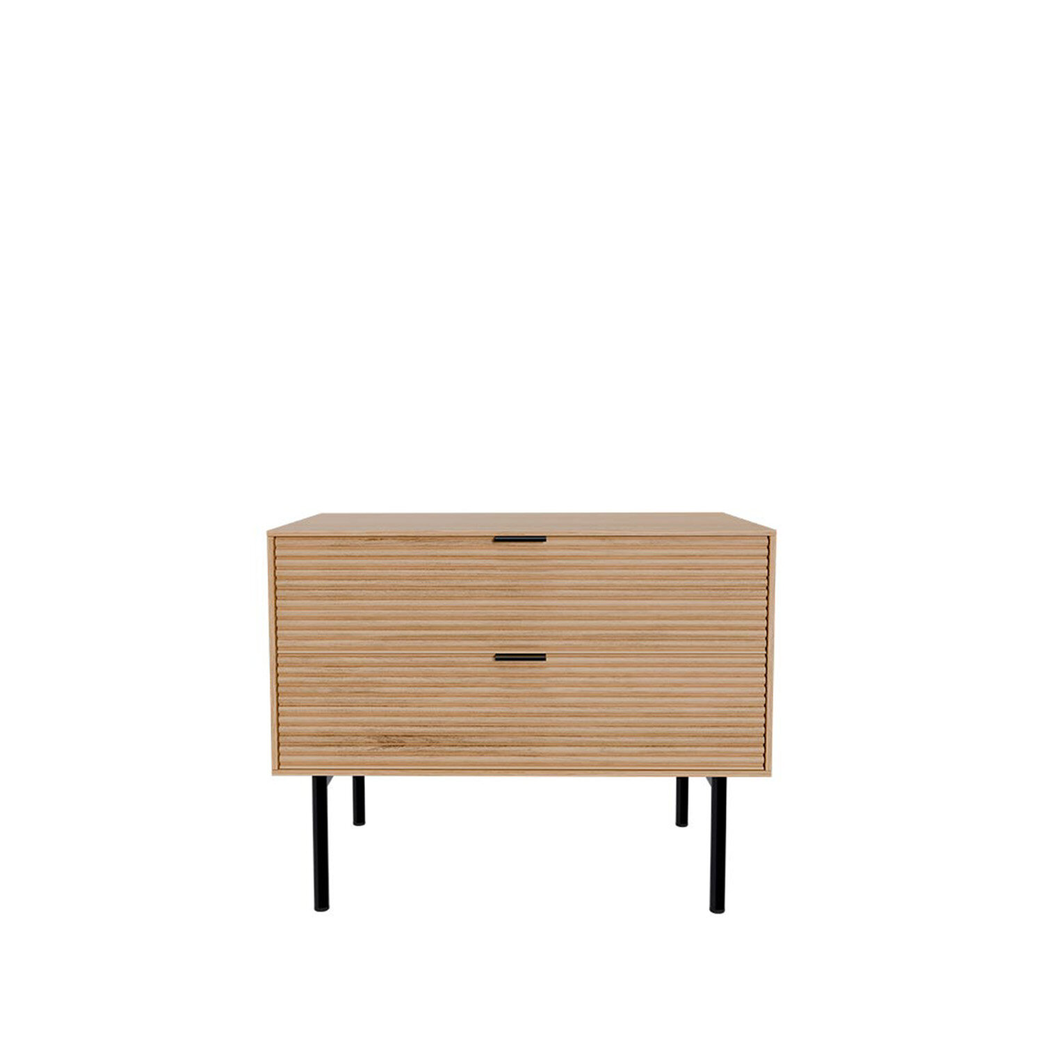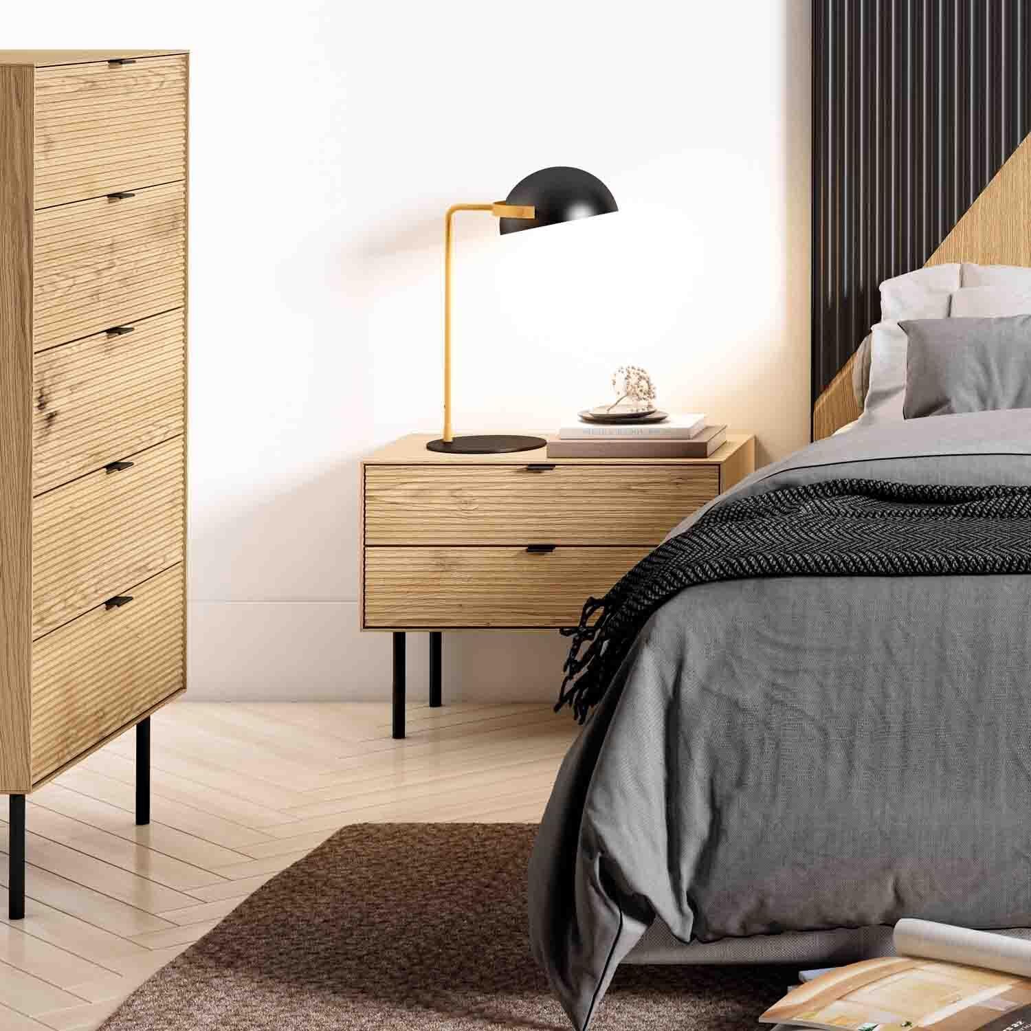 La mesita baja TULSA de 60 cm con dos cajones destaca por su diseño compacto y elegante, ideal para acompañar sofás o camas. Ofrece espacio extra de almacenaje sin renunciar a la estética. Fabricada en chapa de roble con frentes en madera maciza rayada, combina textura natural con acabados metálicos en negro. El sistema soft closing garantiza una apertura suave y silenciosa.