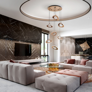 Lámpara en metal y aluminio acabado negro mate arenado. Ocho aros, regulables en altura, con difusor de piezas de acrílico transparente. 162W LED. CCT: 2700-5000 K. 8,100 lm. DIMABLE. Incluye mando a distancia.
