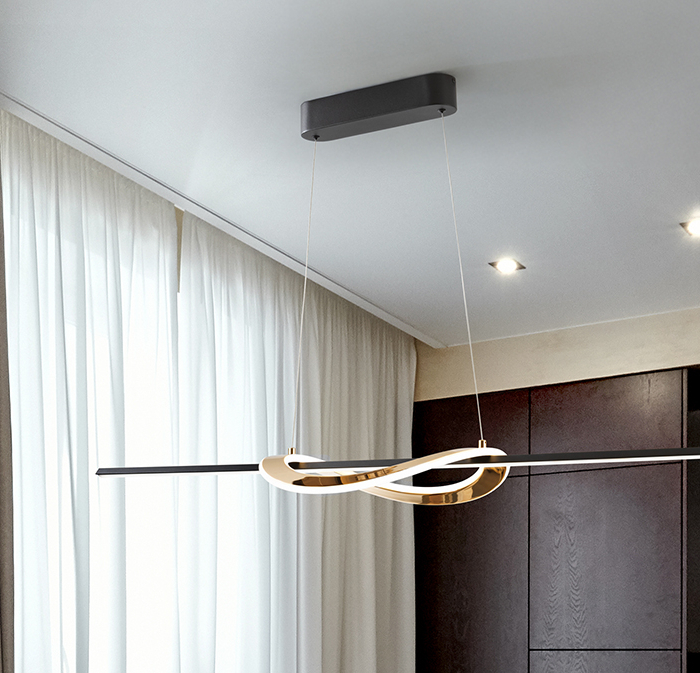 326,00€Lámpara realizada en aluminio y acero acabado en dorado brillo y negro mate. Difusor de silicona opal. Regulable en altura. Iluminación LED 39W, CCT: 2700-5000 K. 3.900 lm. DIMABLE. Incluye mando a distancia.