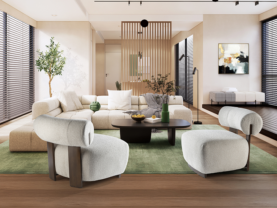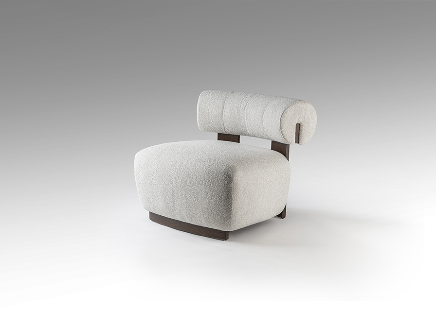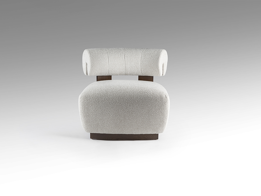 Butaca realizada en madera acabado negro y tapizado en chenilla crudo.