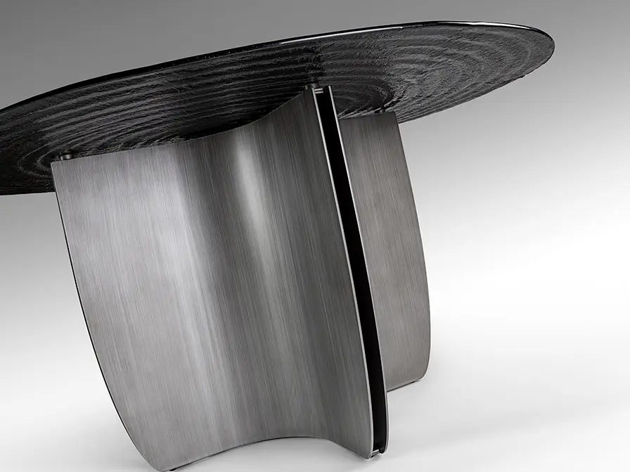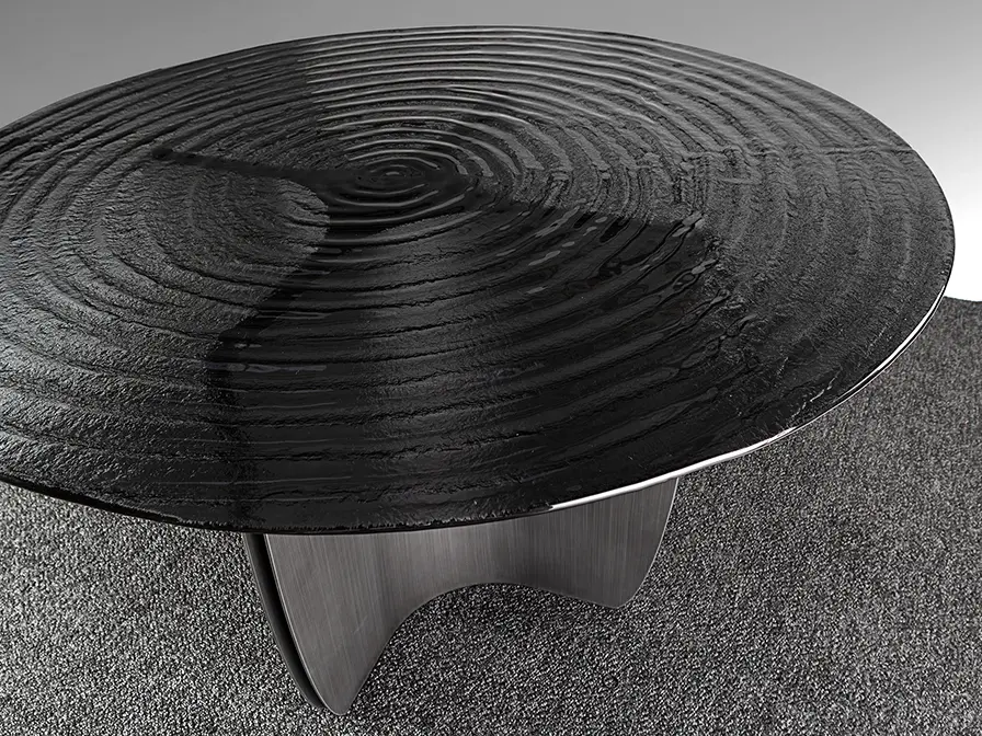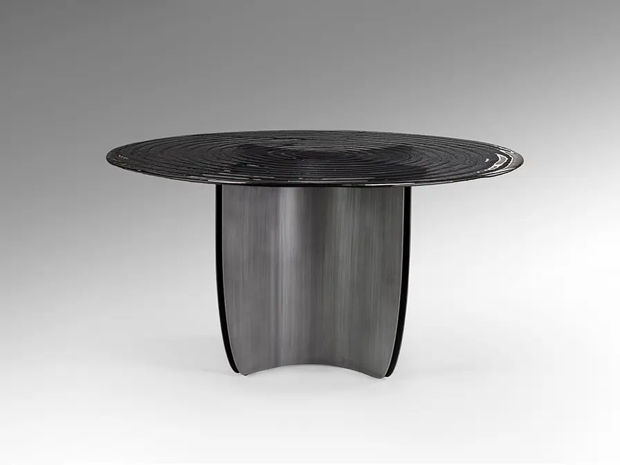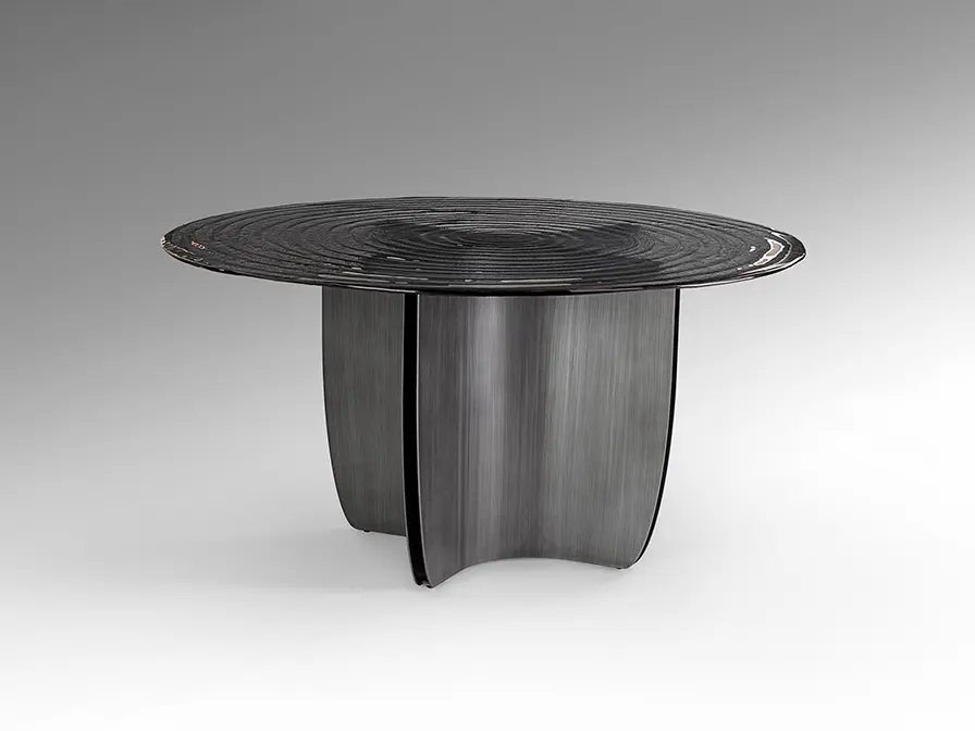 Mesa de comedor redonda, realizada en metal acabado gris plomo patinado. Tapa de cristal termo moldeado gris, superficie con textura de ondas concéntricas.