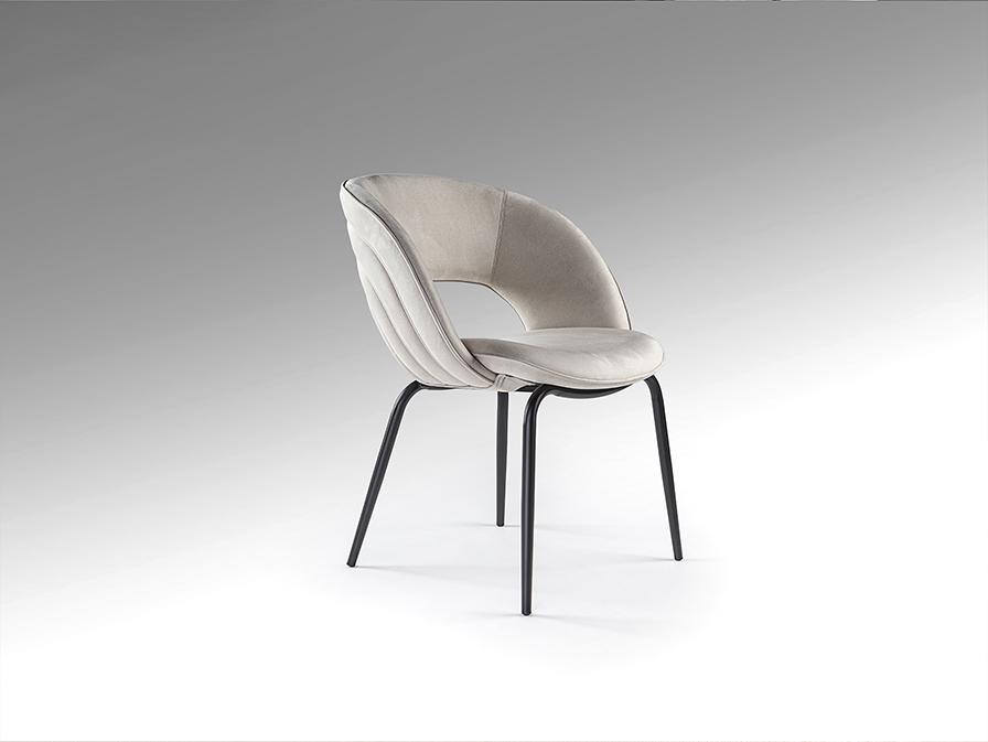 Silla realizada en metal y tablero contrachapado curvado. Patas metálicas acabadas en negro y tapizado simil ante, tono piedra.