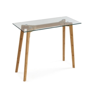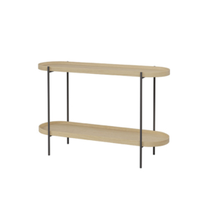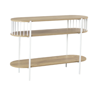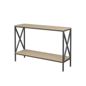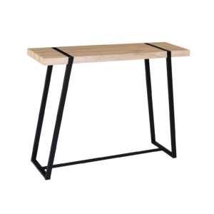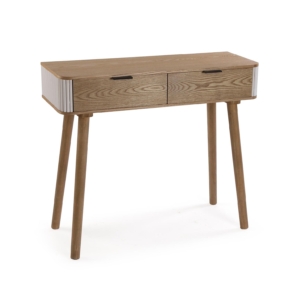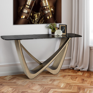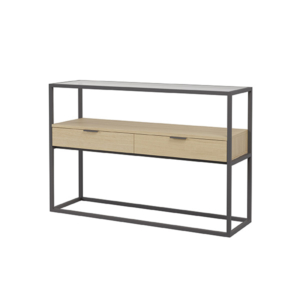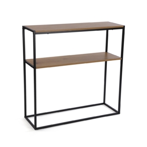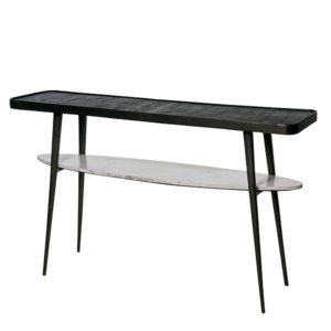 Consola realizada en metal, lacado en negro mate, y madera de nogal. Tapa laminada de porcelánico y cristal, con decoración marmol blanco acabado brillo.