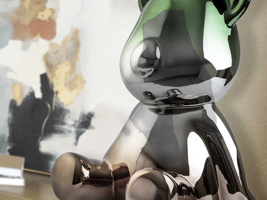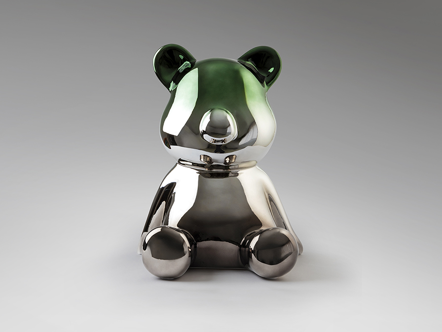Figura de oso con formas redondeadas, tamaño mediano. Realizada en resina, acabado metalizado degradado de gris plomo a verde.