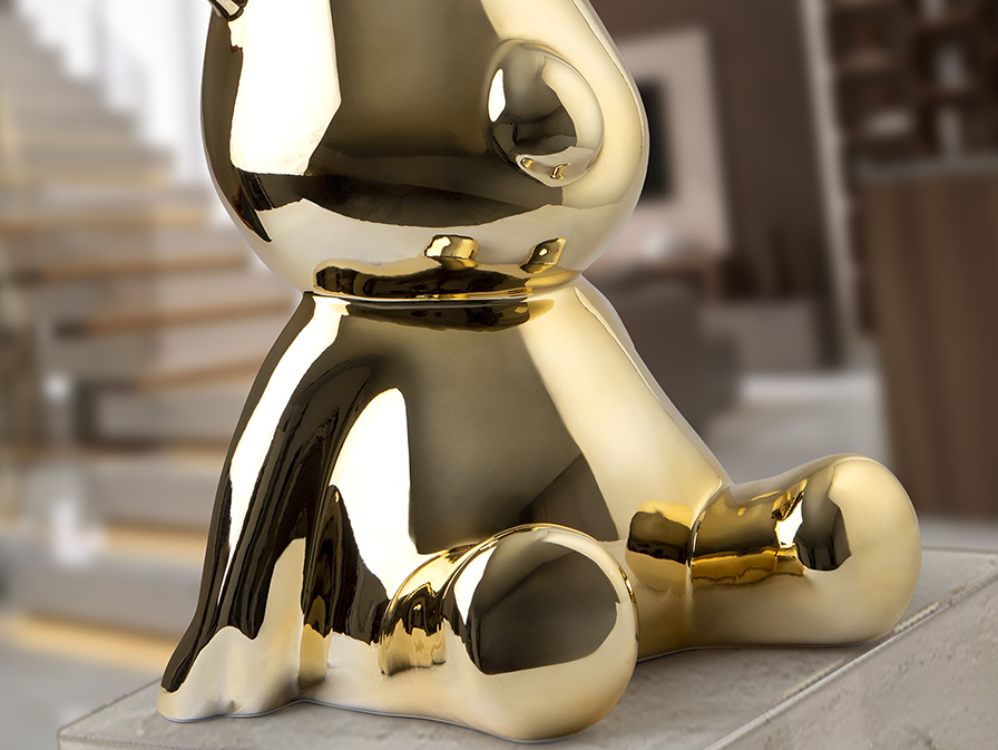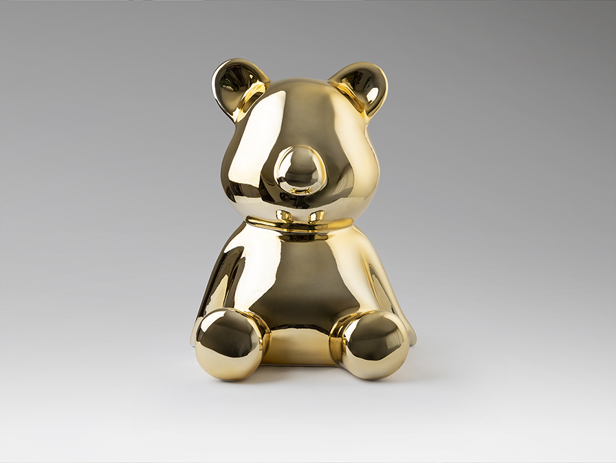 Figura de oso con formas redondeadas, tamaño mediano. Realizada en resina, acabado metalizado dorado.