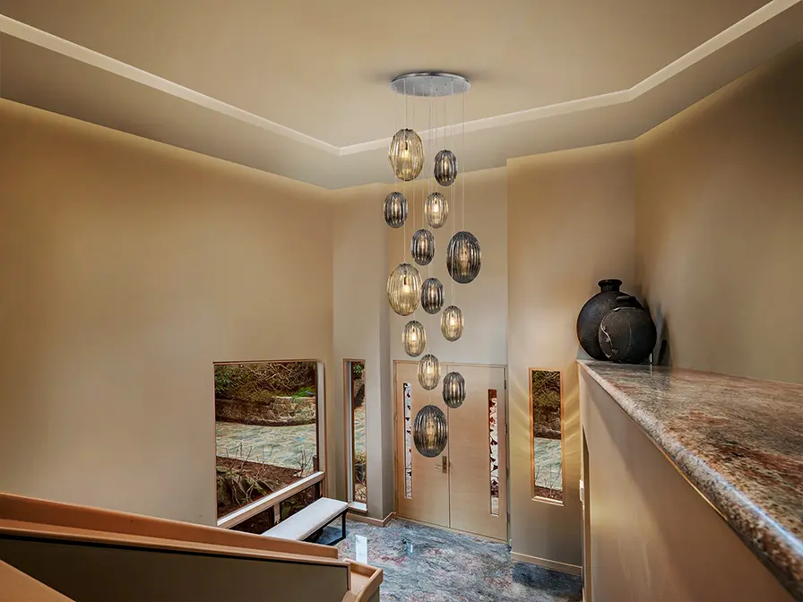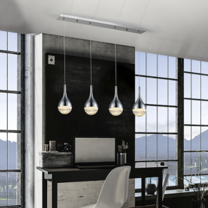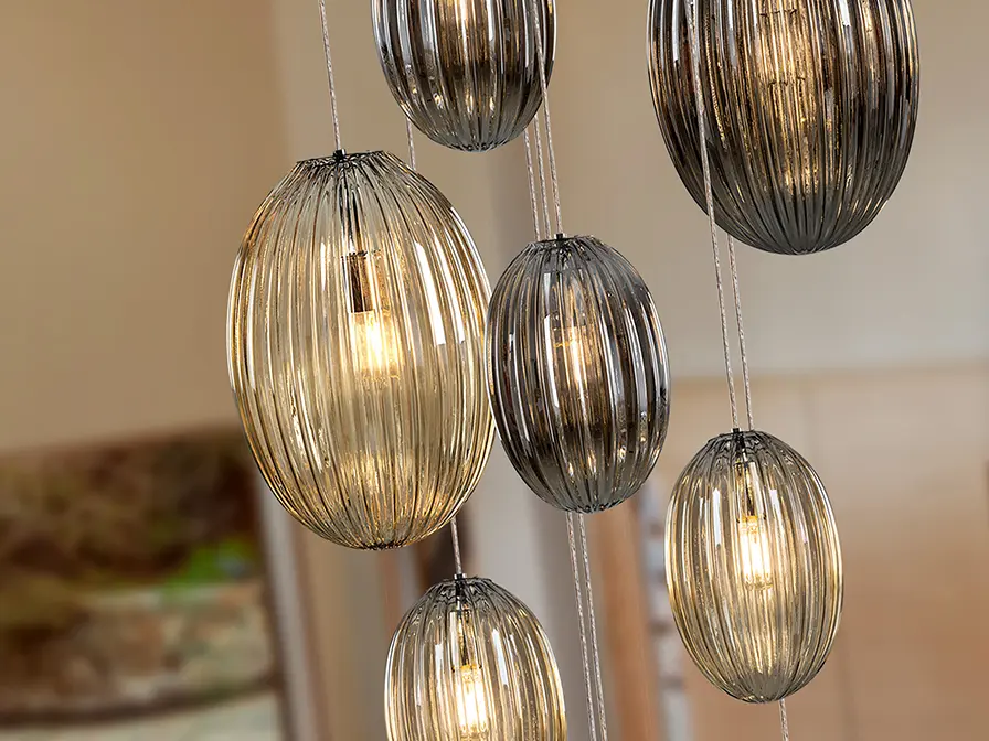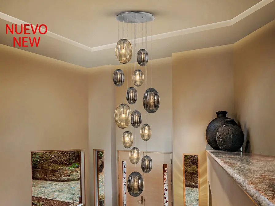 Lámpara de 13 luces, realizada en metal acabado cromo. Tulipas combinadas: grandes y pequeñas. Dos tonos de cristal: coñac y gris smoke espejado. Regulable en altura hasta 500 cm.