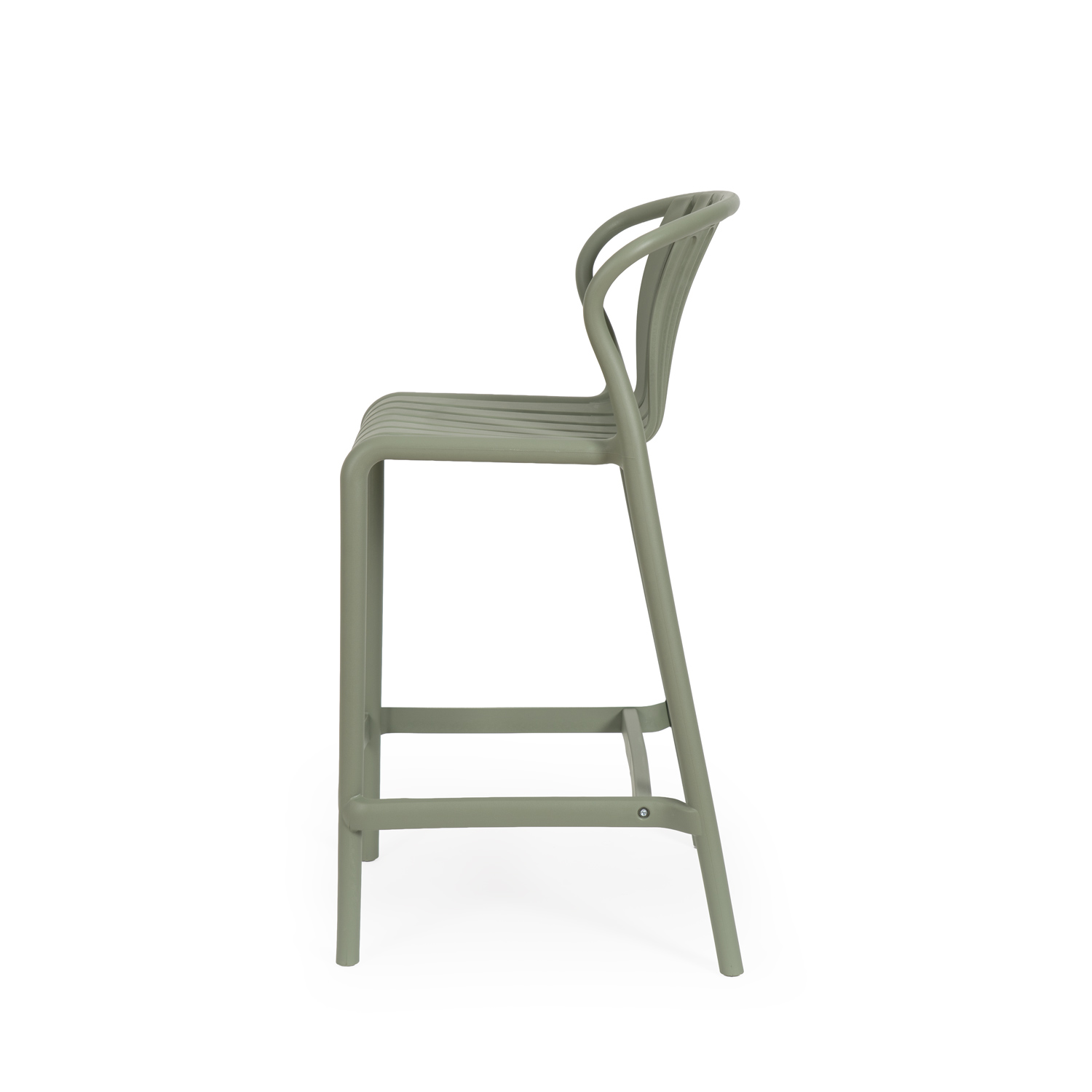 El taburete BASTIAN destaca por su diseño ligero y envolvente, fabricado en resistente polipropileno. Su asiento curvado y ergonómico, con lamas ligeramente separadas, favorece la ventilación y la comodidad incluso en usos prolongados. El respaldo, de líneas suaves y continuidad fluida con la estructura, ofrece un soporte firme sin sacrificar ligereza visual. Disponible en cinco colores actuales —negro, blanco, beige, verde y terracota—, BASTIAN se adapta con naturalidad a cocinas, barras o espacios contract, aportando estilo y funcionalidad en ambientes tanto interiores como semicubiertos.