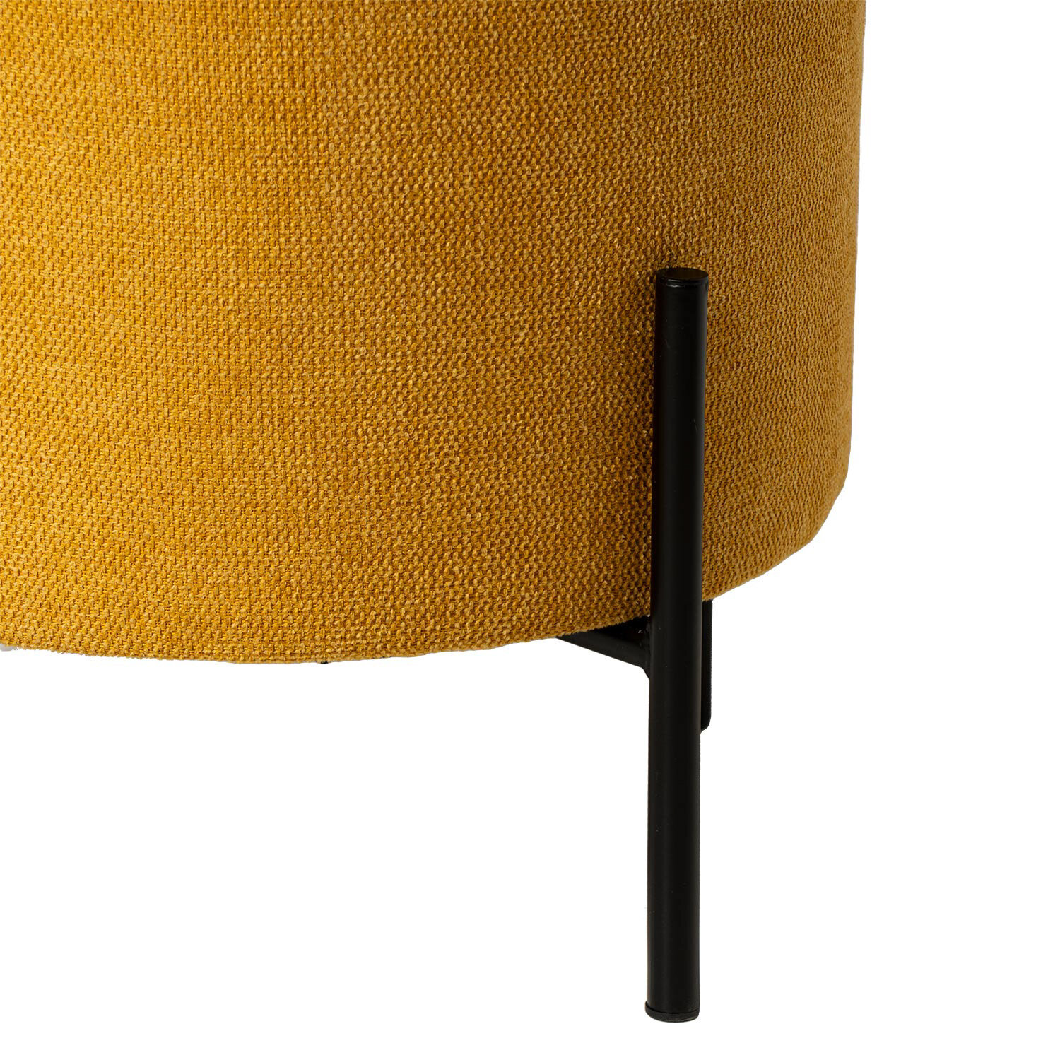 Puff redondo pequeño de tela mostaza y pata metal en negro