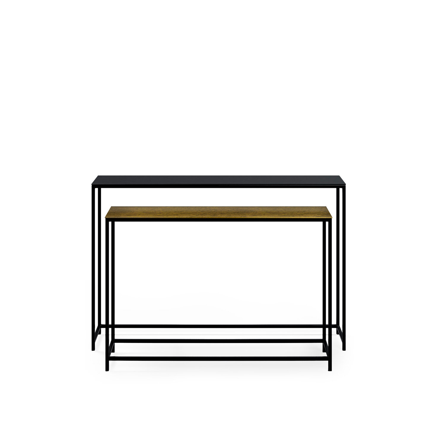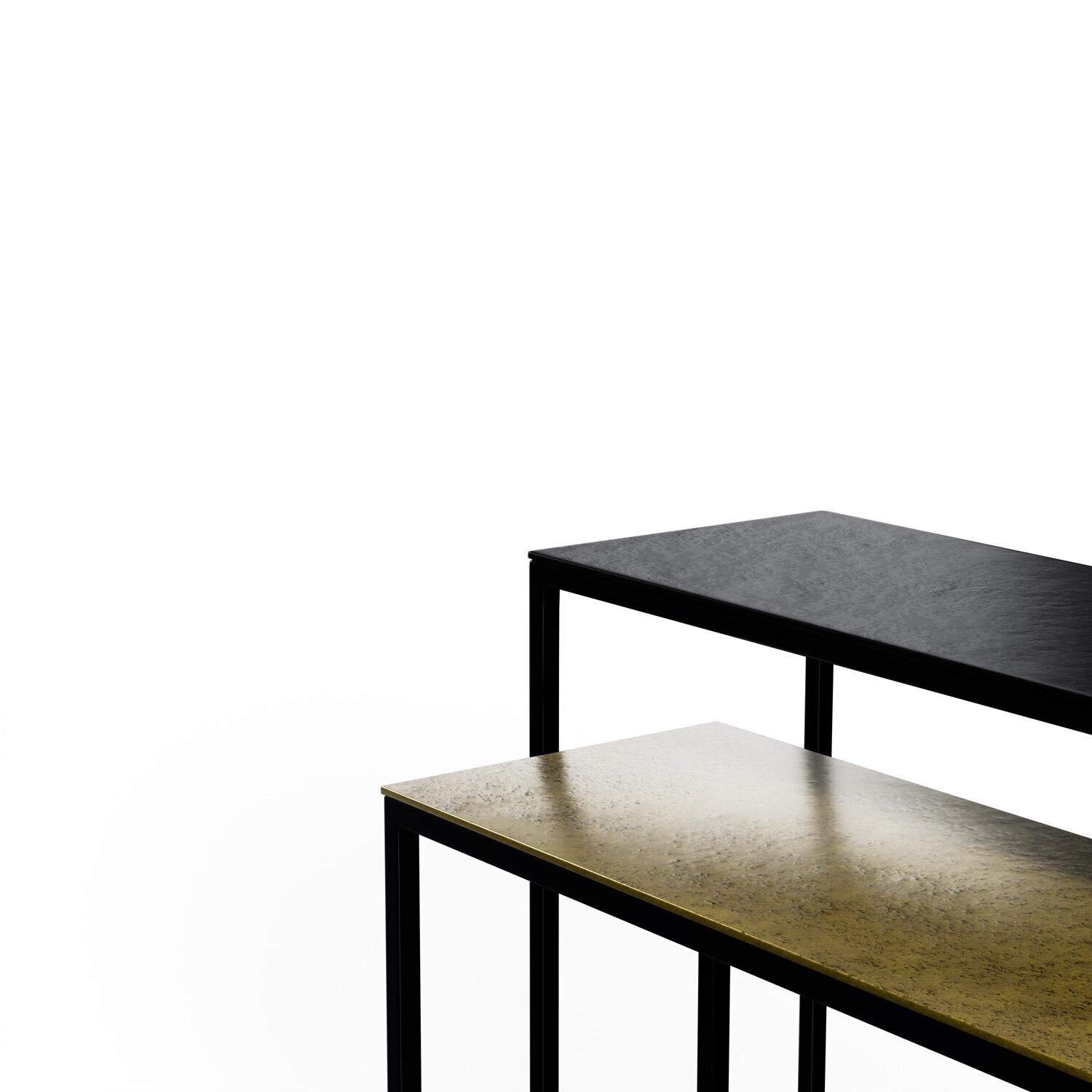 El set de consolas VEDA destaca por su diseño ligero y elegante, ideal para recibidores con personalidad. Cada pieza combina una tapa de aluminio con acabado en negro o dorado envejecido. Las patas de hierro en color negro aportan estabilidad y un aire contemporáneo, contrastando con la delicadeza visual de la superficie. Perfectas para ambientes modernos, industriales o con toques sofisticados, estas consolas pueden usarse juntas o por separado, adaptándose con versatilidad a cualquier espacio. Mesas de diseño artesanal, pueden presentar imperfecciones en su acabado final. No se venden por separado.