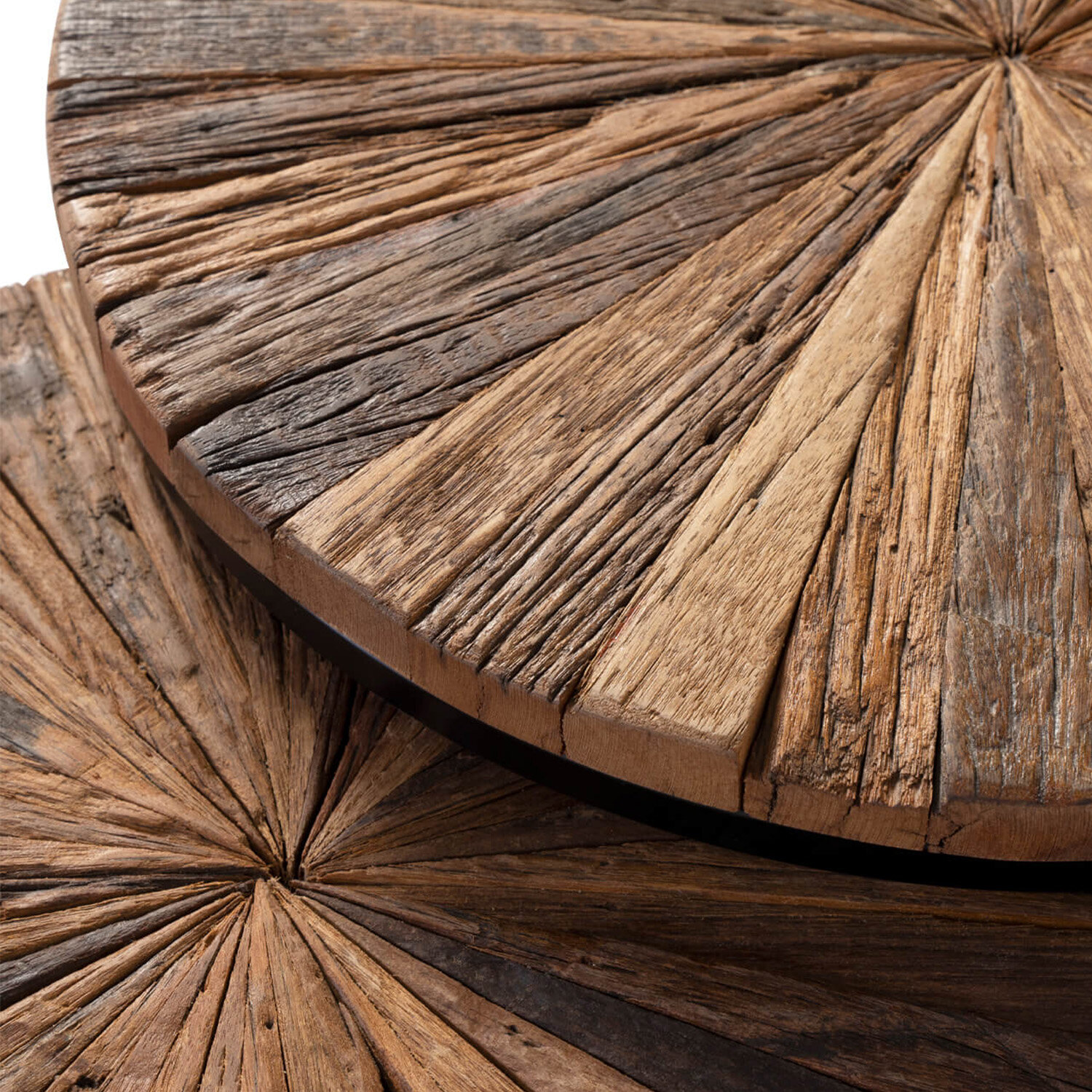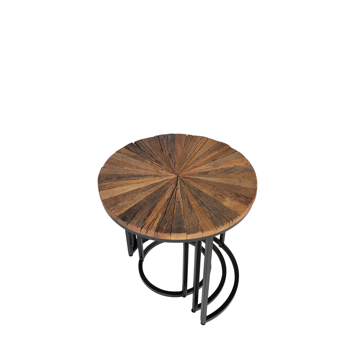 Este set de mesas auxiliares combina a la perfección el encanto rústico con un diseño contemporáneo. Cada mesa presenta una tapa circular de madera reciclada, resaltando la belleza natural y la textura única de la madera. Las patas, hechas de hierro lacado en negro mate, aportan un toque moderno y elegante. El set de mesas auxiliares NAKUL es ideal para añadir estilo y naturalidad a cualquier hogar, siendo perfecto para el salón, la sala de estar o cualquier espacio que necesite un toque de elegancia y funcionalidad. No se venden por separado.