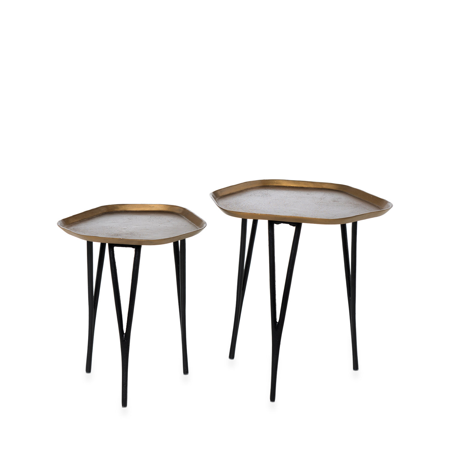 El set de mesas auxiliares PUNJABI fusiona el carácter artesanal con un estilo contemporáneo y sofisticado. Compuesto por dos mesas de distintos tamaños, este conjunto destaca por sus tapas de aluminio en un tono cobre envejecido, que aportan calidez y personalidad al diseño. Lejos de ser superficies perfectamente lisas, las tapas presentan un contorno irregular y una textura que evidencia su carácter artesanal. Estas formas orgánicas crean un efecto visual atractivo, donde las ligeras ondulaciones y variaciones realzan la autenticidad del acabado, haciendo que cada mesa sea única e irrepetible. Las patas de metal negro contrastan con el cobre y añaden un toque industrial que equilibra el conjunto, manteniendo una estructura ligera y estable. No se venden por separado.