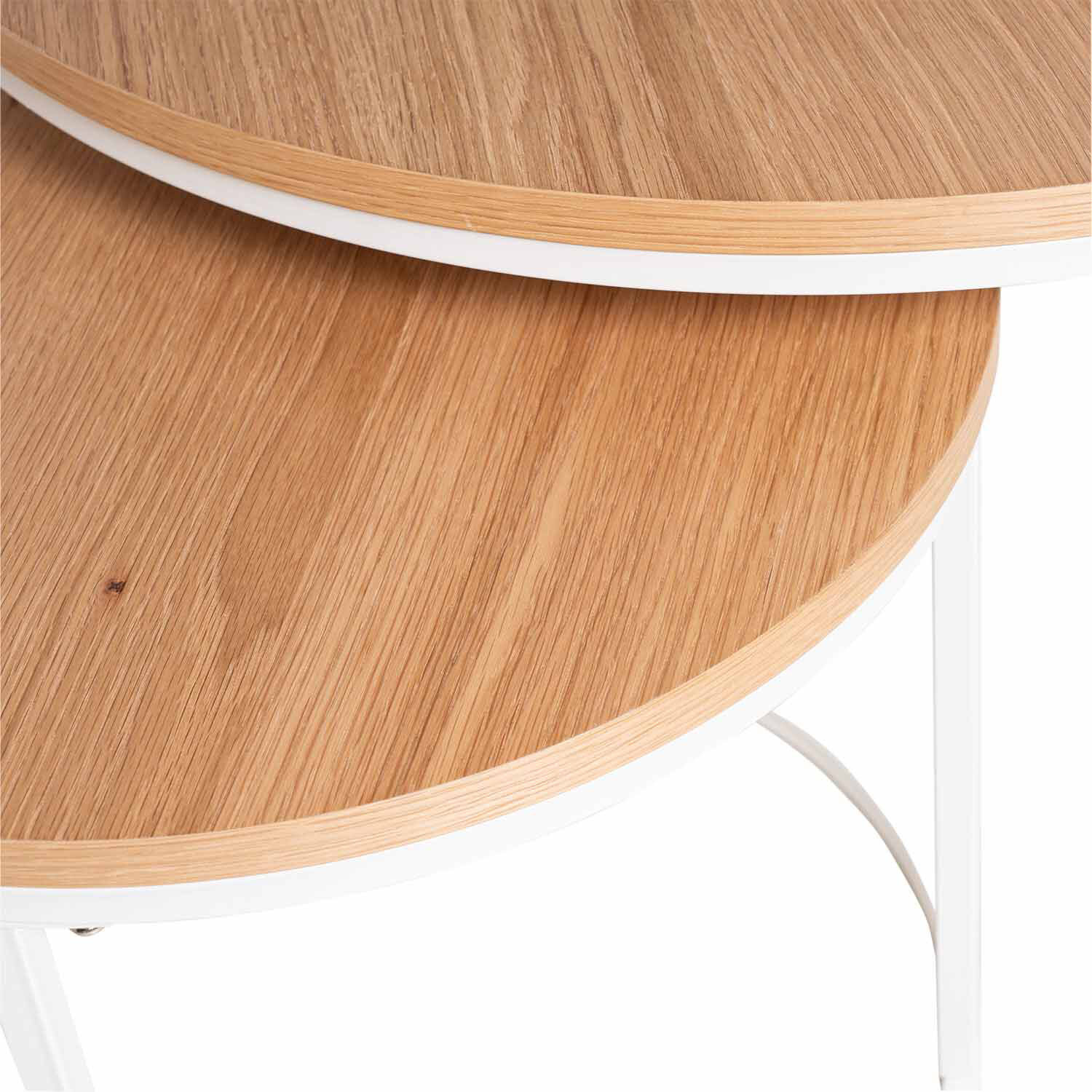 Detalles: Características: MESA 1: Ancho: ø80 cm Fondo: ø80 cm Alto: 45 cm Advertencia tolerancia: +/- 2 cm MESA 1: Ancho: ø50 cm Fondo: ø50 cm Alto: 38 cm Advertencia tolerancia: +/- 2 cm | MANTENIMIENTO: Recomendaciones: No colocar cerca de fuentes de calor o luz solar. Es recomendable quitar el polvo de los tapizados. Los elementos afilados o metálicos pueden rayar la superficie o producir desgarros. Uso y mantenimiento: Limpiar con paño ligeramente humedecido en agua y jabón neutro con movimientos en círculo. Frotar suavemente. Secar con paño seco. No utilizar productos abrasivos o químicos (lejías, acetonas, disolventes, etc.). Se puede utilizar ligeramente agua y jabón neutro para superficie | PAQUETES: Nº paquetes: 1 Artículos por paquetes: 1 Dimensión paquete: 87 x 87 x 12 cm Peso embalaje: 16 kg Manipulación: 2 personas | CARACTERÍSTICAS: Detalles Tapa: CHAPA ROBLE Detalles Pata: METAL Requiere montaje: SÍ Código del producto: 00MC508724 Las imágenes y/o colores de los productos pueden variar ligeramente por motivos de calibrado de pantalla, luz ambiente de la fotografía, ángulo de la misma, remesa producción madera, textil, etc.