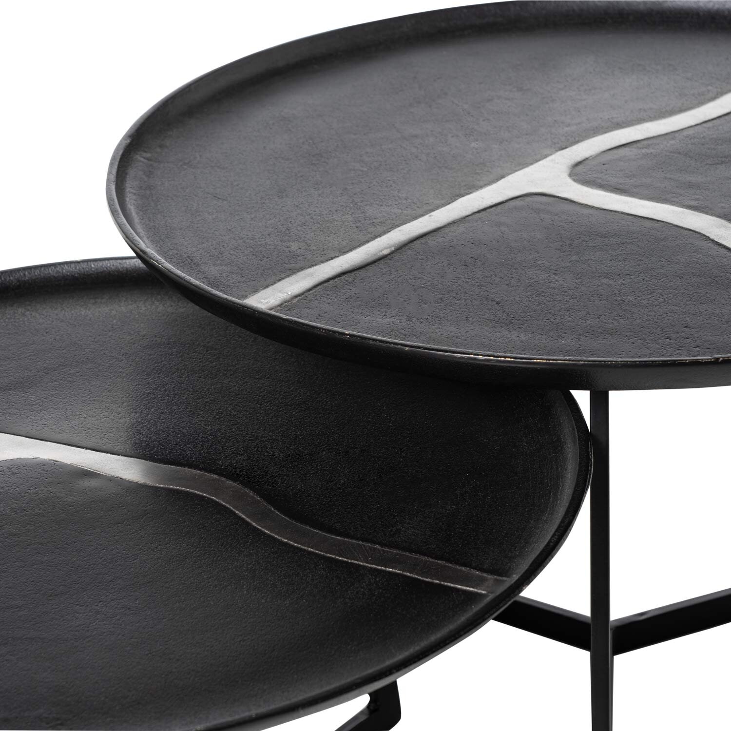 La mesa de centro RAVI es una pieza excepcional que fusiona elegancia y modernidad, diseñada para destacar y enriquecer cualquier espacio, ya sea en el hogar o en oficinas con estilo. Se trata de un conjunto de dos mesas elaboradas en metal de alta calidad con un sofisticado acabado texturizado que imita un diseño marmolado. Las sutiles líneas blancas sobre el fondo negro aportan un aire artístico y refinado, convirtiendo a estas mesas en un elemento decorativo que trasciende su funcionalidad. Las formas redondeadas de sus superficies, combinadas con las patas en disposición de estrella, crean una estética contemporánea que se adapta perfectamente a una variedad de estilos decorativos. Ya sea en ambientes minimalistas, industriales o incluso eclécticos, el set de mesas RAVI se convierte en un punto focal que añade carácter y distinción. Su diseño equilibrado no solo ofrece versatilidad, sino también la capacidad de transformar espacios con una mezcla de sobriedad y dinamismo. Mesas de