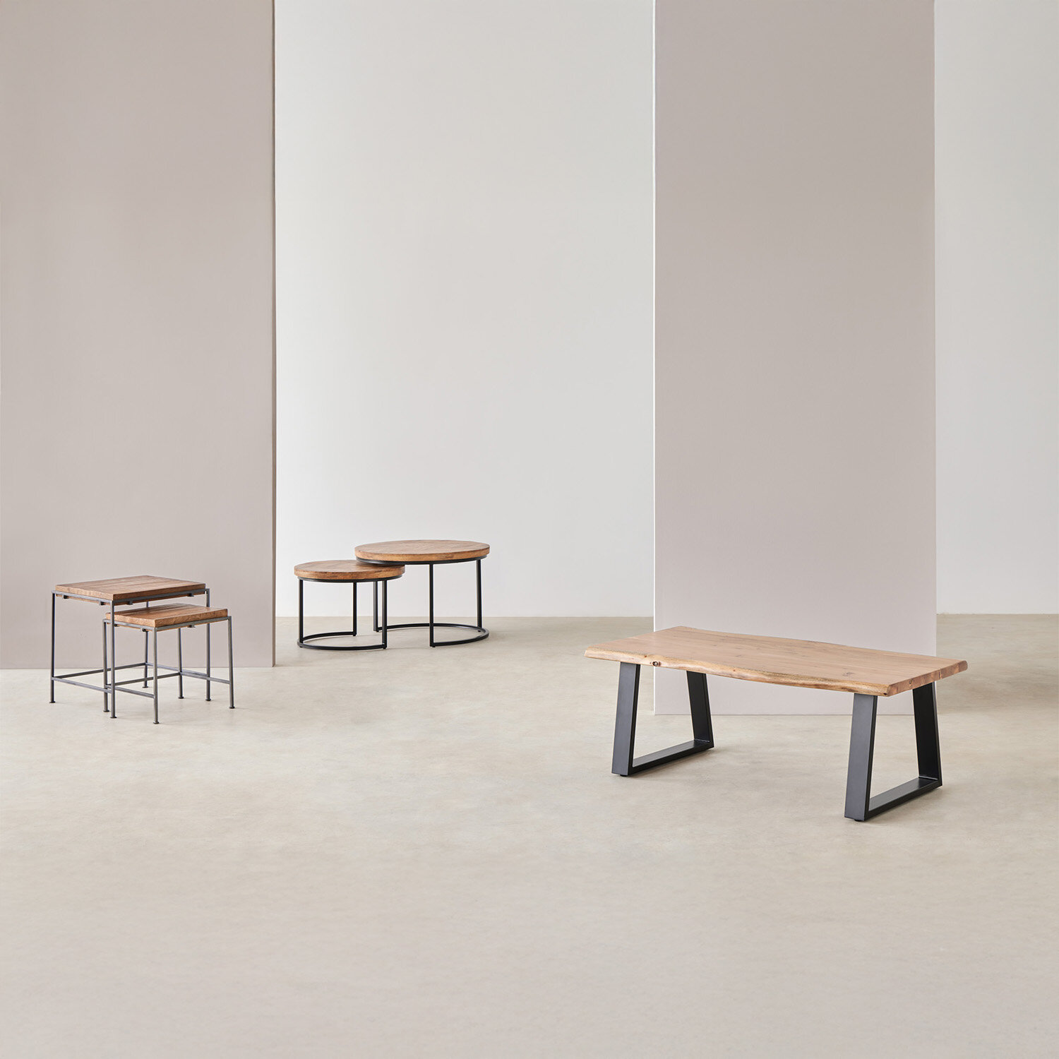 El set de mesas de centro ZAID aporta un toque rústico y contemporáneo con su diseño que combina materiales naturales y acabados industriales. Las tapas están elaboradas en madera de mango, donde las vetas y tonalidades naturales se convierten en protagonistas, creando superficies llenas de carácter y calidez. Las patas de hierro negro contrastan con la madera, aportando firmeza y un aire moderno que equilibra la estética del conjunto. Gracias a sus tamaños diferenciados, las mesas pueden utilizarse juntas o por separado, adaptándose a diferentes composiciones y necesidades. No se venden por separado.