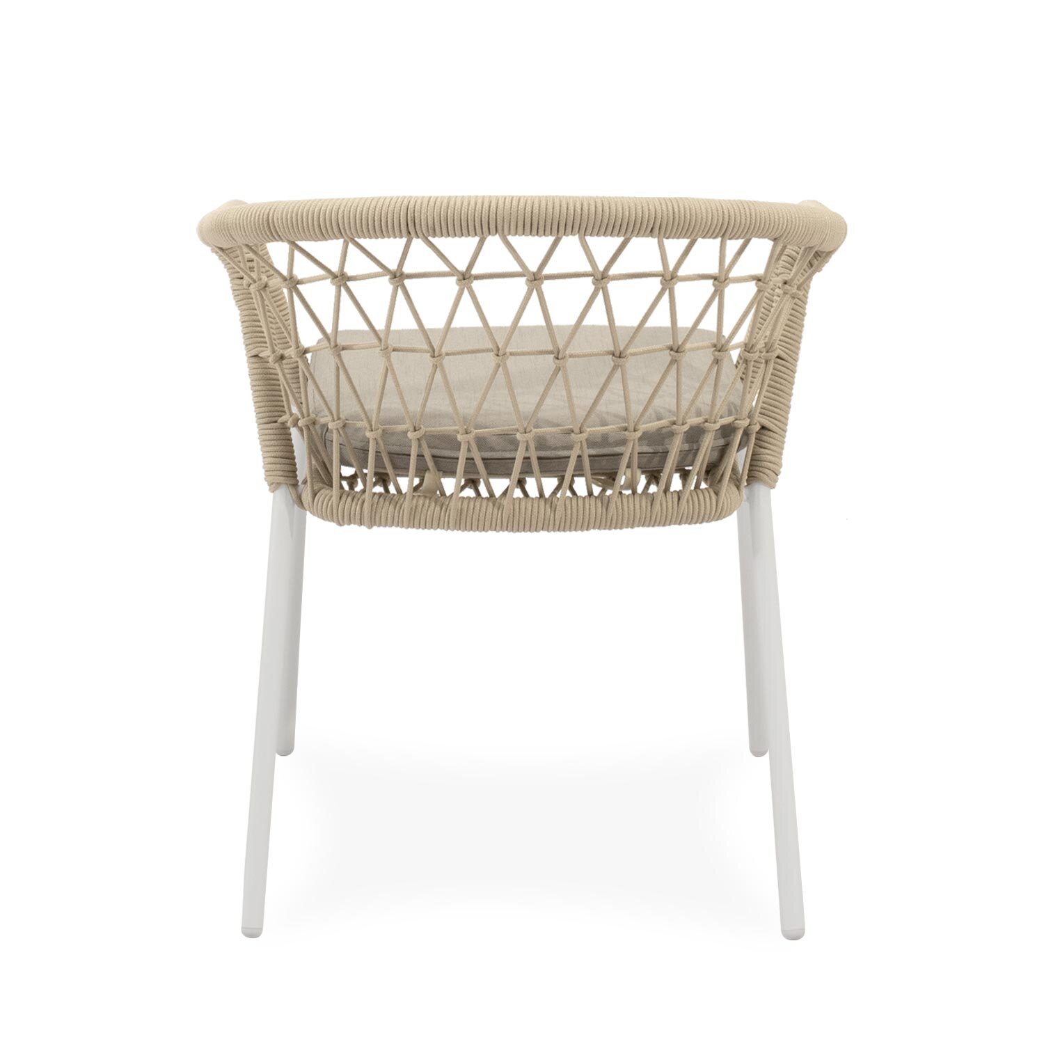La estructura de la silla SOLENE está compuesta por un entramado de cuerda resistente que envuelve suavemente el respaldo y los reposabrazos, creando un efecto visual atractivo y aportando un soporte ergonómico. Disponible en tonos naturales, permite integrarse en terrazas, jardines o patios, aportando un toque contemporáneo y acogedor. Las patas de acero sometido a un tratamiento específico para exteriores, ligeramente inclinadas, añaden estabilidad y resistencia, garantizando un soporte firme incluso en espacios exteriores. El asiento acolchado, tapizado en poliéster, ofrece un confort adicional, ideal para largas tertulias o momentos de relajación al aire libre. Perfecta para ambientes boho-chic, modernos o mediterráneos, la silla SOLENE es la elección ideal para quienes buscan estilo y comodidad en una sola pieza.