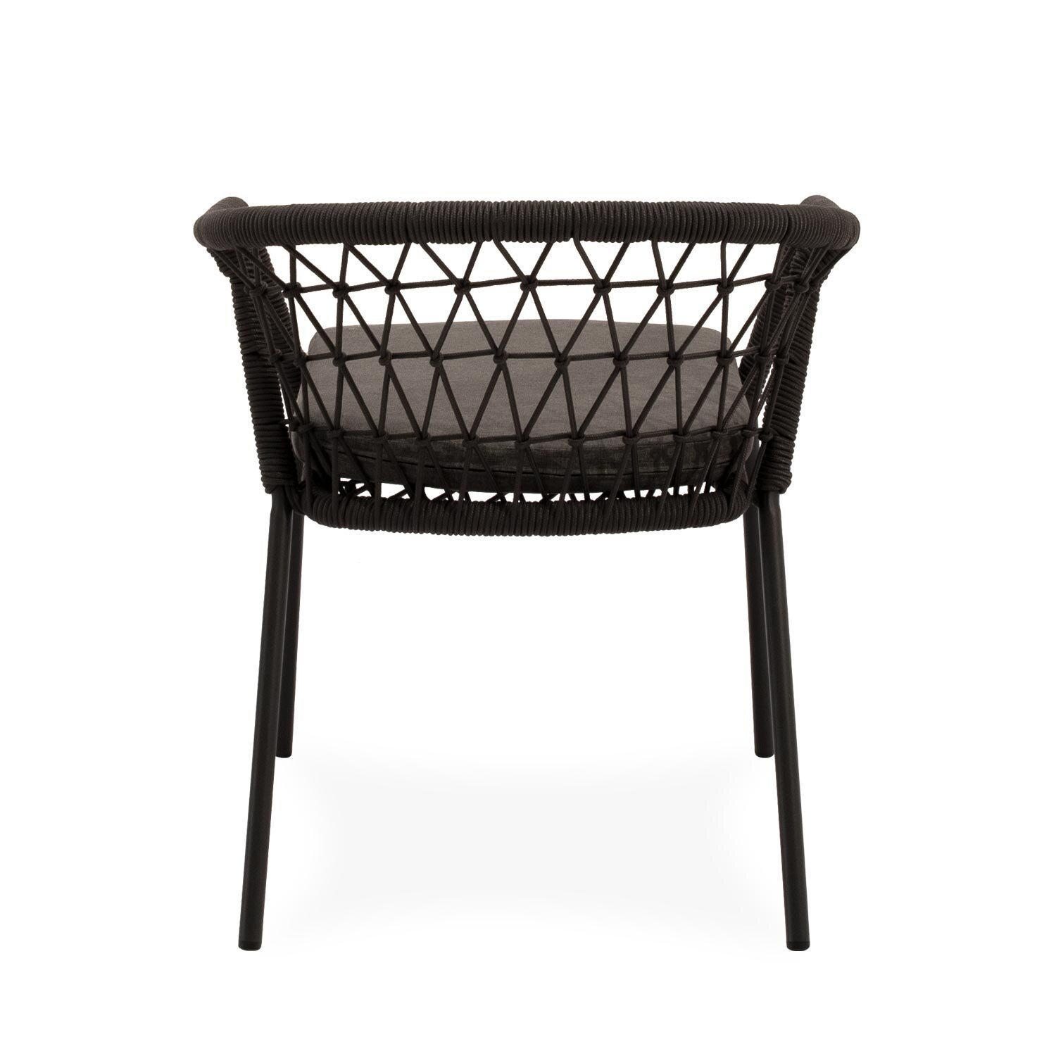 La estructura de la silla SOLENE está compuesta por un entramado de cuerda resistente que envuelve suavemente el respaldo y los reposabrazos, creando un efecto visual atractivo y aportando un soporte ergonómico. Disponible en tonos naturales, permite integrarse en terrazas, jardines o patios, aportando un toque contemporáneo y acogedor. Las patas de acero sometido a un tratamiento específico para exteriores, ligeramente inclinadas, añaden estabilidad y resistencia, garantizando un soporte firme incluso en espacios exteriores. El asiento acolchado, tapizado en poliéster, ofrece un confort adicional, ideal para largas tertulias o momentos de relajación al aire libre. Perfecta para ambientes boho-chic, modernos o mediterráneos, la silla SOLENE es la elección ideal para quienes buscan estilo y comodidad en una sola pieza.