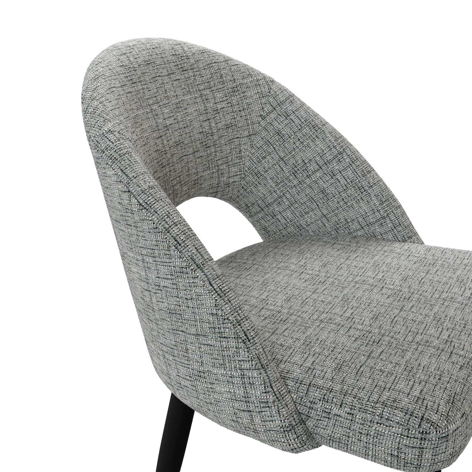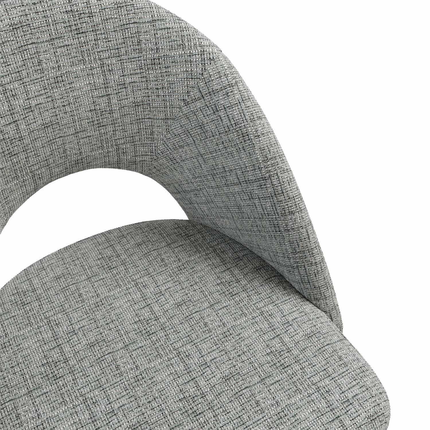 La silla DORIS es el ejemplo perfecto de diseño moderno y minimalista, ideal para ambientes contemporáneos. Su asiento y respaldo curvos y acolchados están tapizados en un elegante color gris claro, proporcionando no solo una apariencia acogedora, sino también un alto nivel de comodidad. El elemento más llamativo es, sin duda, la apertura curvilínea en el respaldo, que añade un toque distintivo y sofisticado al diseño general.