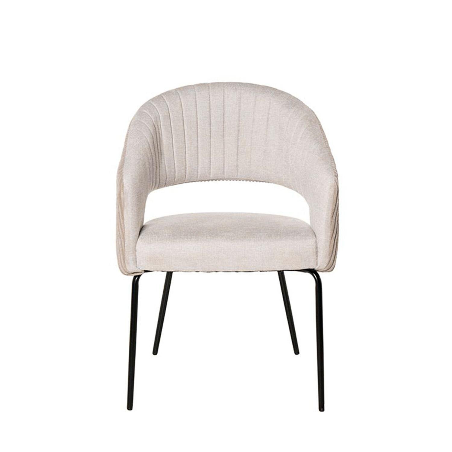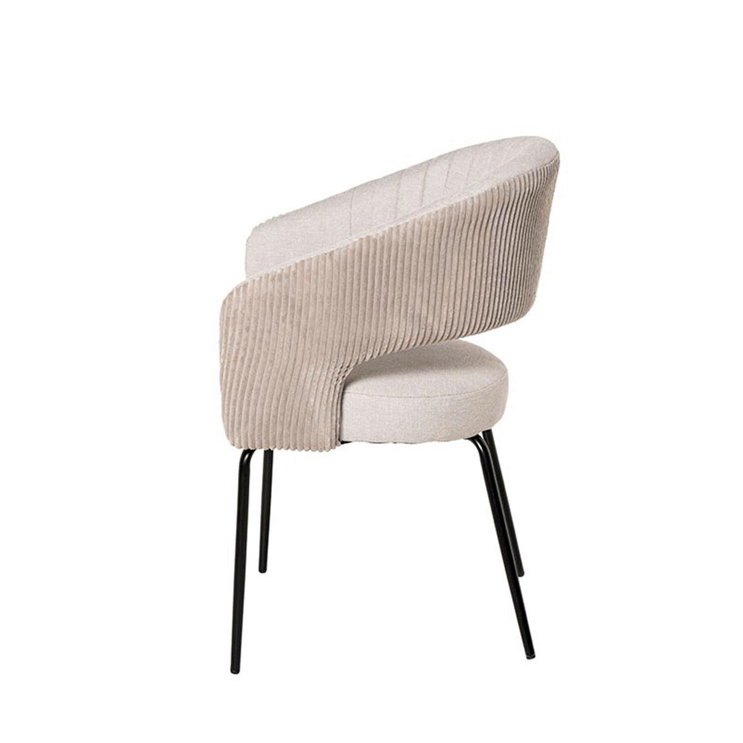 La silla ELEONOR es una pieza única que destaca por su combinación de dos tipos de tejido: la parte delantera está tapizada en un tejido liso y elegante, mientras que la parte trasera del respaldo y los reposabrazos presenta un tacto aterciopelado, aportando una textura suave. Un detalle de diseño chic es el agujero en la parte trasera, que no solo añade un toque moderno, sino que también mejora su estética general. Las patas metálicas no solo garantizan una gran estabilidad, sino que también le confieren un aspecto sofisticado y elegante, haciendo de esta silla una opción ideal para decorar ambientes de cualquier estilo, desde los más clásicos hasta los más contemporáneos.
