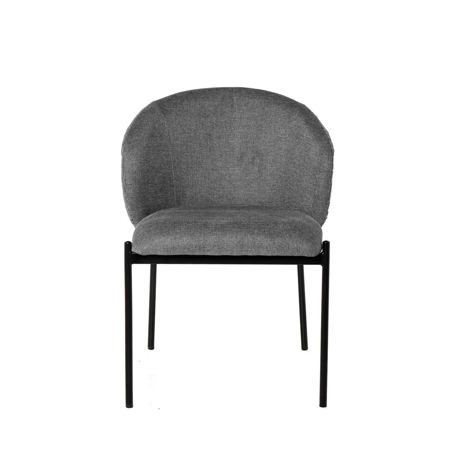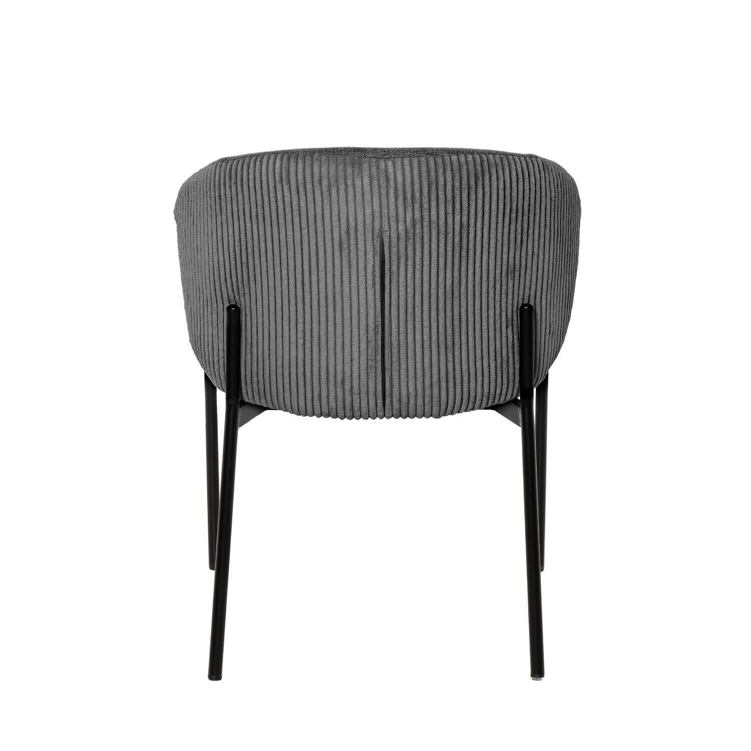 La combinación de dos tejidos diferentes en color gris oscuro hace de la silla FAINA un artículo muy especial. El tejido liso en la parte delantera y el tejido aterciopelado en la parte trasera, con diseño vertical, le dan un toque elegante y proporcionan una sensación suave al tacto. Su respaldo ancho y ligeramente cóncavo permite que la espalda repose cómodamente, ofreciendo mayor confort. Además, las patas negras de metal contrastan con el color neutro del resto de la silla, aportándole un aspecto aún más sofisticado.