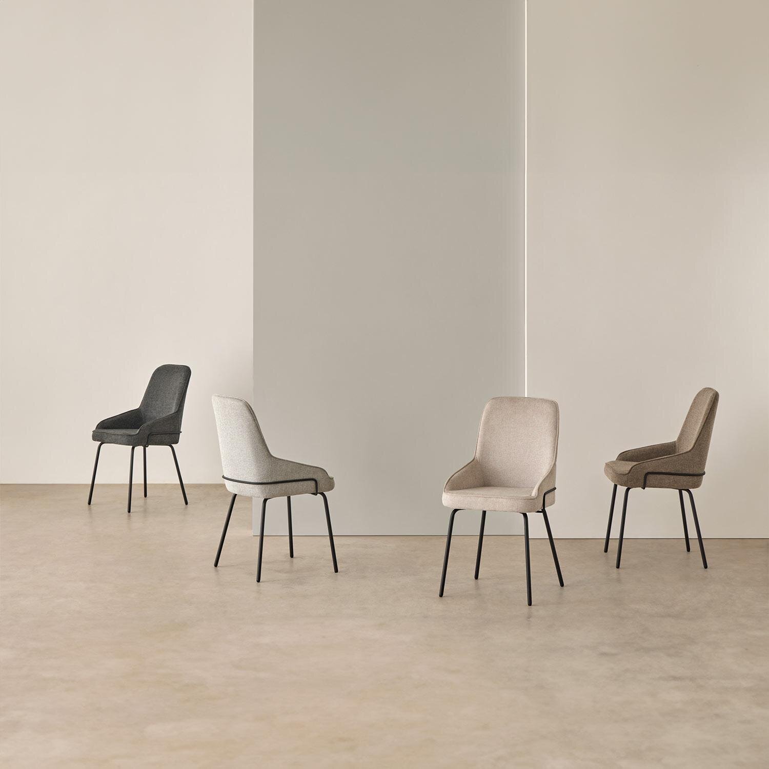 Elegante silla con respaldo alto y estructura acolchada, diseñada para maximizar la comodidad y el uso prolongado. Como detalle de diseño, la barra metálica negra en la parte trasera del respaldo, al igual que sus patas, le confiere un toque sofisticado y moderno. Además, cuenta con reposabrazos que aumentan aún más su comodidad, permitiendo un apoyo ergonómico para los brazos.
