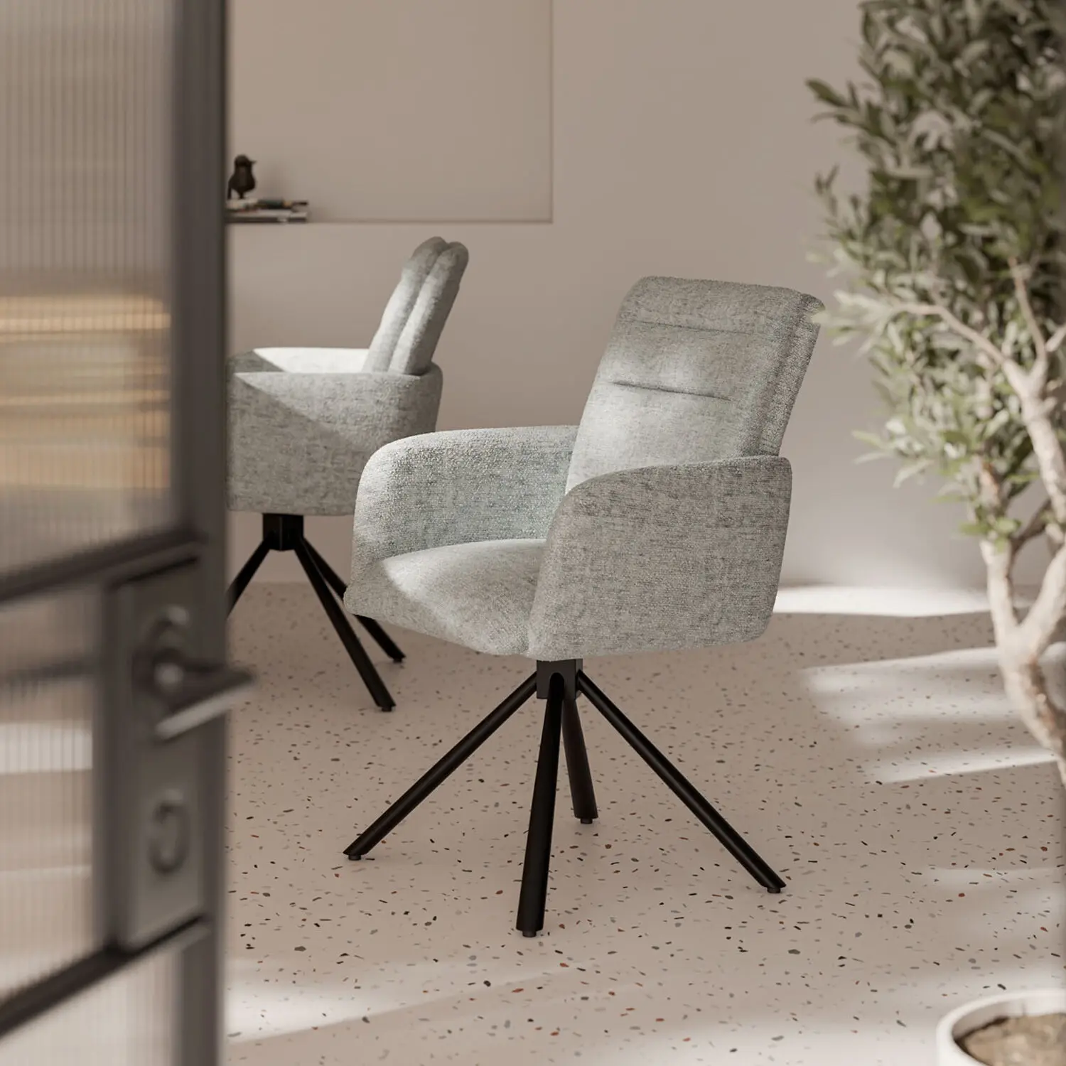 La silla LINDA presenta una estructura de líneas rectas con respaldo y reposabrazos altos, proporcionando un mayor confort gracias a su completo acolchado. El tapizado en chenille es increíblemente suave al tacto, ofreciendo una experiencia de confort única. Su textura captura la luz creando delicadas variaciones de color según la orientación de la trama del hilo. Este modelo es giratorio a 180º y cuenta con un sistema de retorno , lo que hace de la silla LINDA una excelente elección para el uso diario. Además, su base de patas metálicas en color negro no solo añade un toque de estilo, sino que también proporciona una mayor resistencia.