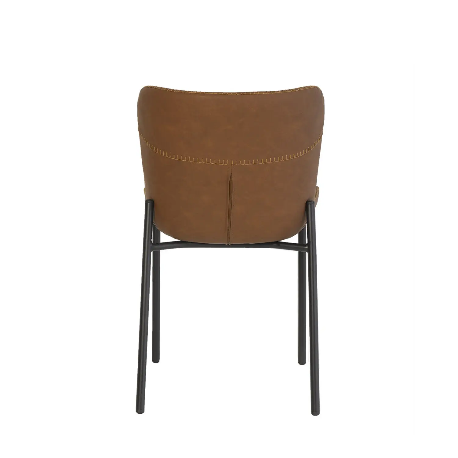 La silla MAYKA en color marrón es una pieza que fusiona elegancia y modernidad, destacándose por su diseño distintivo. Su respaldo, con una forma ligeramente curvada, se adapta ergonómicamente a la espalda, mientras que el amplio y acolchado asiento garantiza un confort excepcional. Ambos elementos están tapizados en polipiel, adornados con un sutil bordado que añade un toque de sofisticación y resalta la forma. Las patas de metal proporcionan una base sólida y duradera, asegurando estabilidad y aportando un estilo industrial.