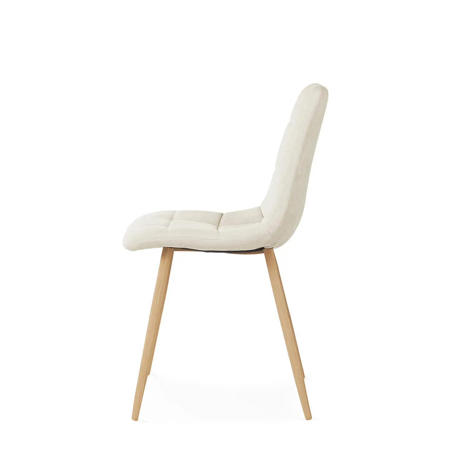 Detalles: CARACTERÍSTICAS: Tejido: SIGNO/BEIGE Características tejido: -100% POLIÉSTER -TEST DE ABRASIÓN 20.000 -CIGARETTE RESISTANT -OEKO-TEX STANDARD 100 Apilable: NO Giratorio: NO Requiere montaje: SÍ Peso soportado: 120 kg Código del producto: 00SL122825 Las imágenes y/o colores de los productos pueden variar ligeramente por motivos de calibrado de pantalla, luz ambiente de la fotografía, ángulo de la misma, remesa producción madera, textil, etc. | MANTENIMIENTO: Recomendaciones: No colocar cerca de fuentes de calor o luz solar. Es recomendable quitar el polvo de los tapizados. Los elementos afilados o metálicos pueden rayar la superficie o producir desgarros. Uso y mantenimiento: Limpiar con paño ligeramente humedecido en agua y jabón neutro con movimientos en círculo. Frotar suavemente. Secar con paño seco. No utilizar productos abrasivos o químicos (lejías, acetonas, disolventes, etc.). Se puede utilizar ligeramente agua y jabón neutro para superficie | DIMENSIONES: Ancho total: 46 cm Alto total: 87 cm Fondo total: 54 cm Peso: 4,8 kg Altura suelo asiento: 50 cm Altura respaldo: 40 cm Ancho respaldo: 40 cm Ancho asiento: 46 cm Fondo asiento: 38 cm Medida entre patas (frontal): 40 cm Medida entre patas (trasera): 40 cm Advertencia tolerancia: +/- 2 cm | PAQUETES: Nº paquetes: 1 Artículos por paquetes: 4 Dimensión paquetes: 65 x 49 x 70 cm Peso embalaje: 22 kg Tapón en patas: SÍ Manipulación: 1 persona
