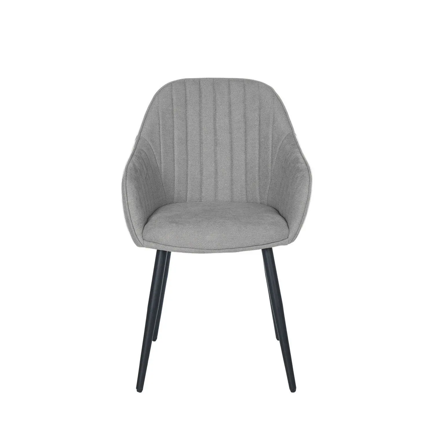 La silla NATALIA combina comodidad y diseño. Su estructura acolchada con reposabrazos y respaldo alto, junto con su tejido en color gris claro con grabado en líneas verticales, le confiere un estilo elegante y sofisticado. Además, es una silla muy cómoda, ideal para comedores o salas de estar. Sus patas metálicas en color negro proporcionan durabilidad y estabilidad, asegurando una larga vida útil.