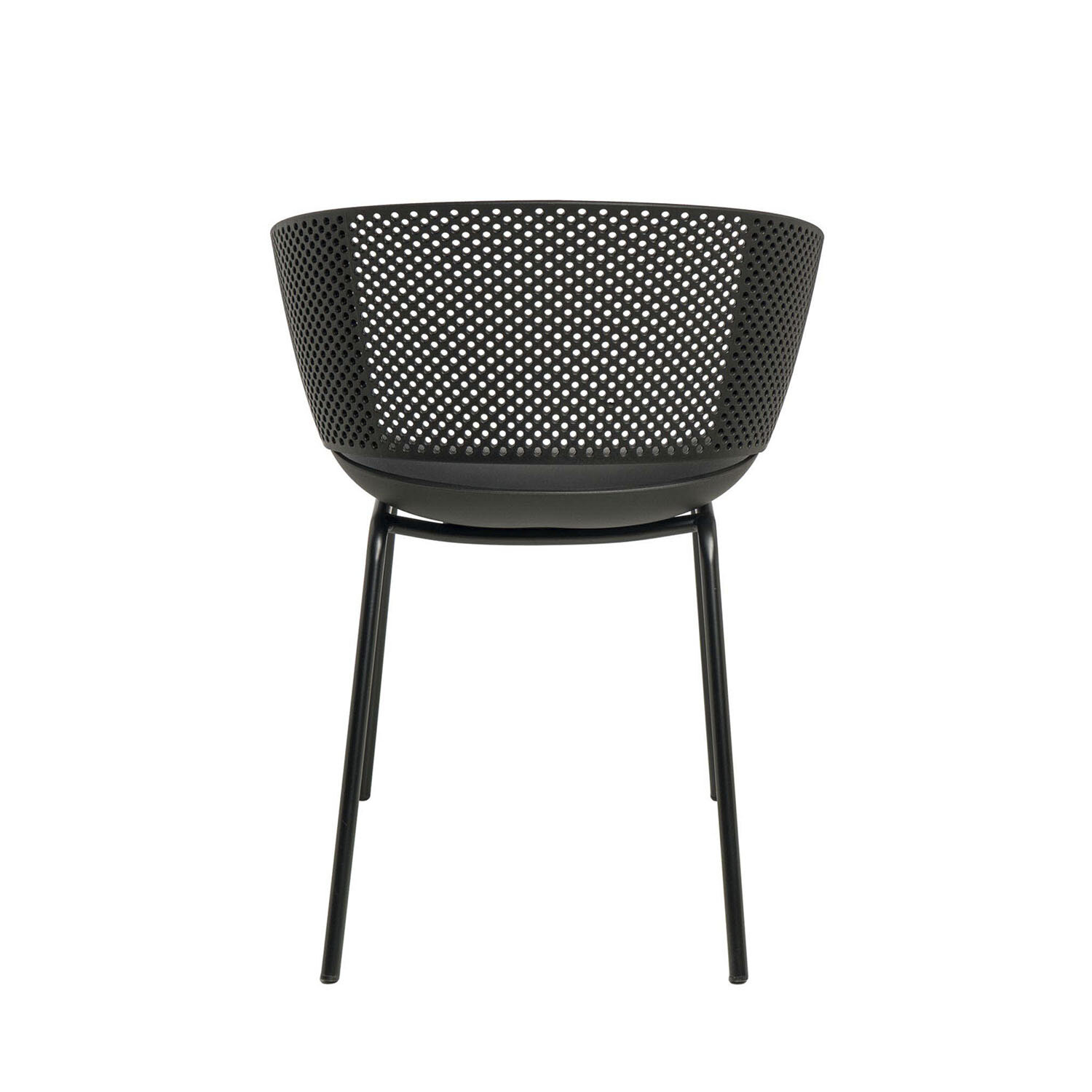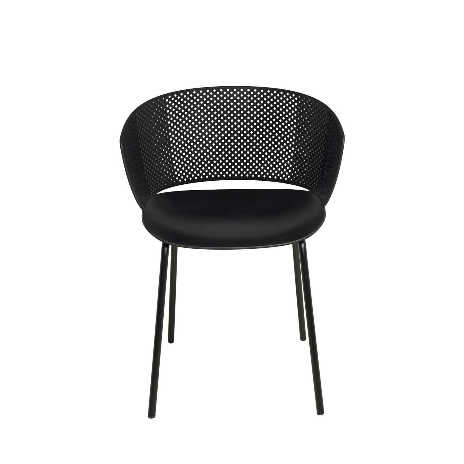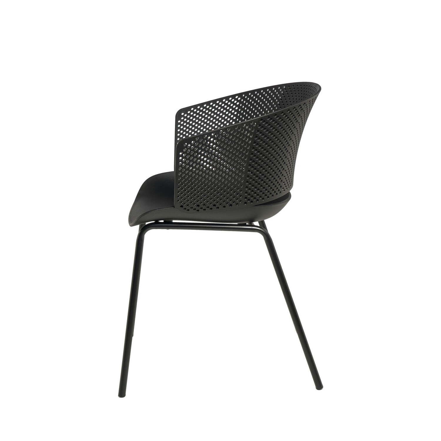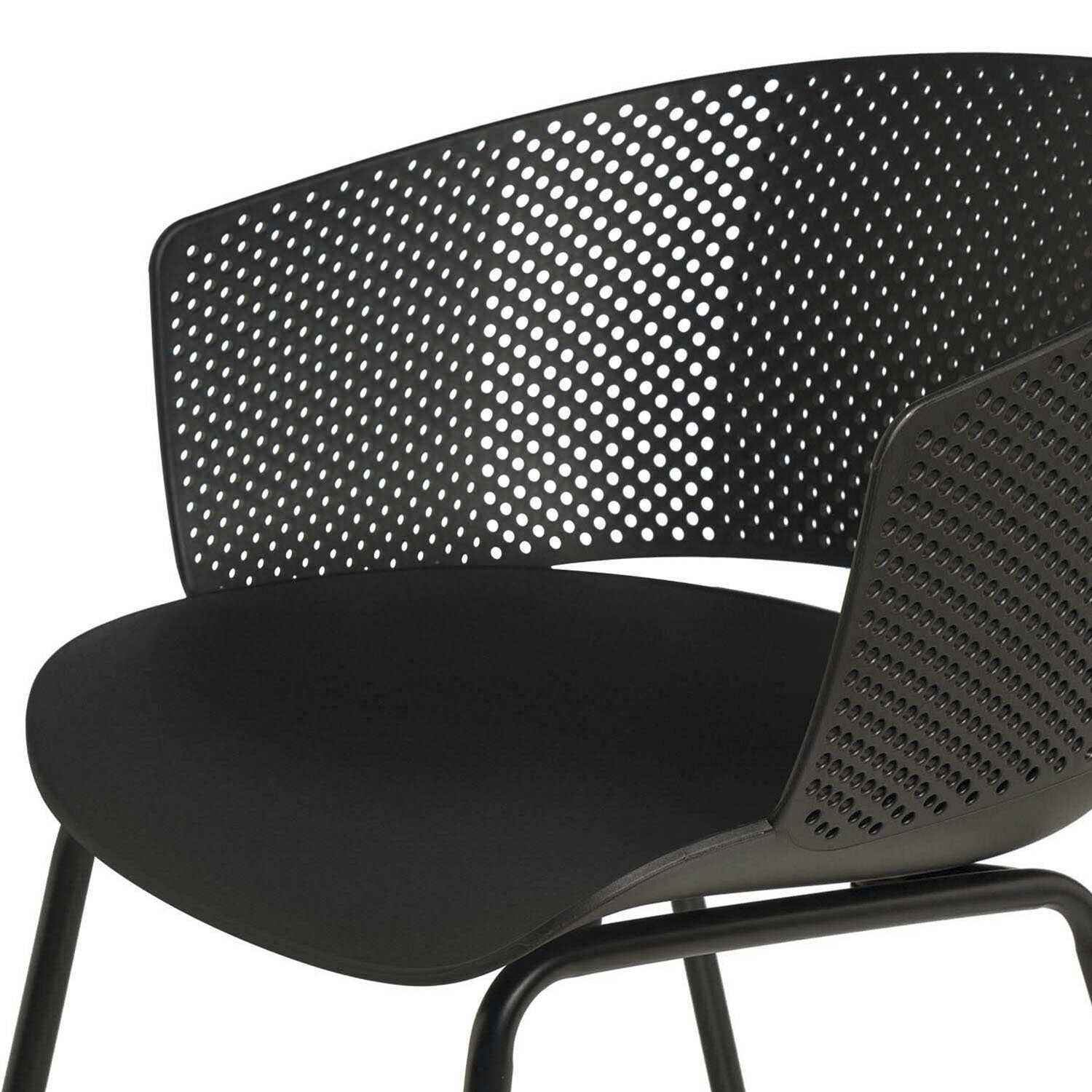 La silla NOELLE combina diseño vanguardista con comodidad. Su respaldo ergonómico, con perforaciones que aportan un toque de estilo, se adapta perfectamente a la curva de la espalda. La estructura de polipropileno y las patas de metal en color negro le proporcionan resistencia y un diseño atemporal.