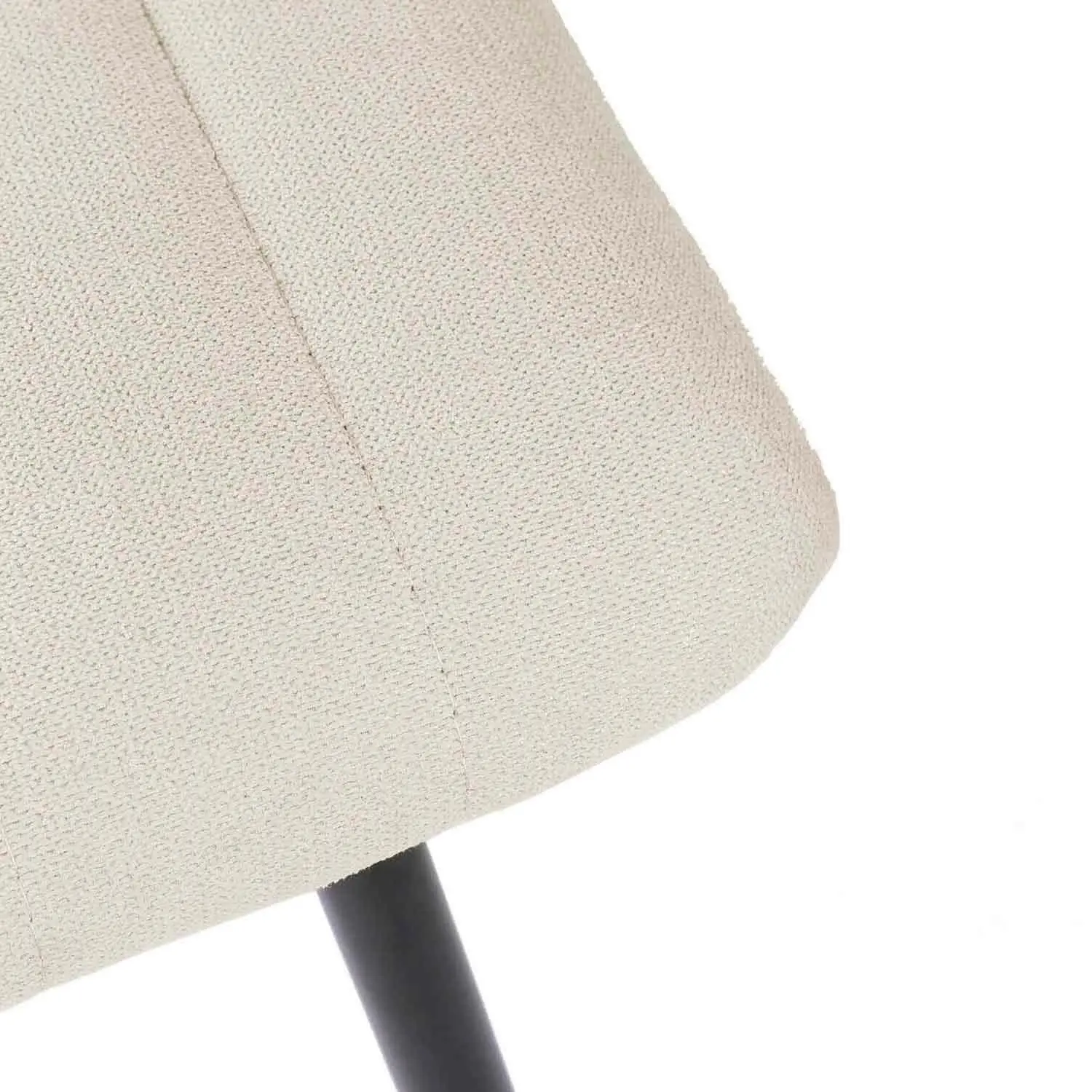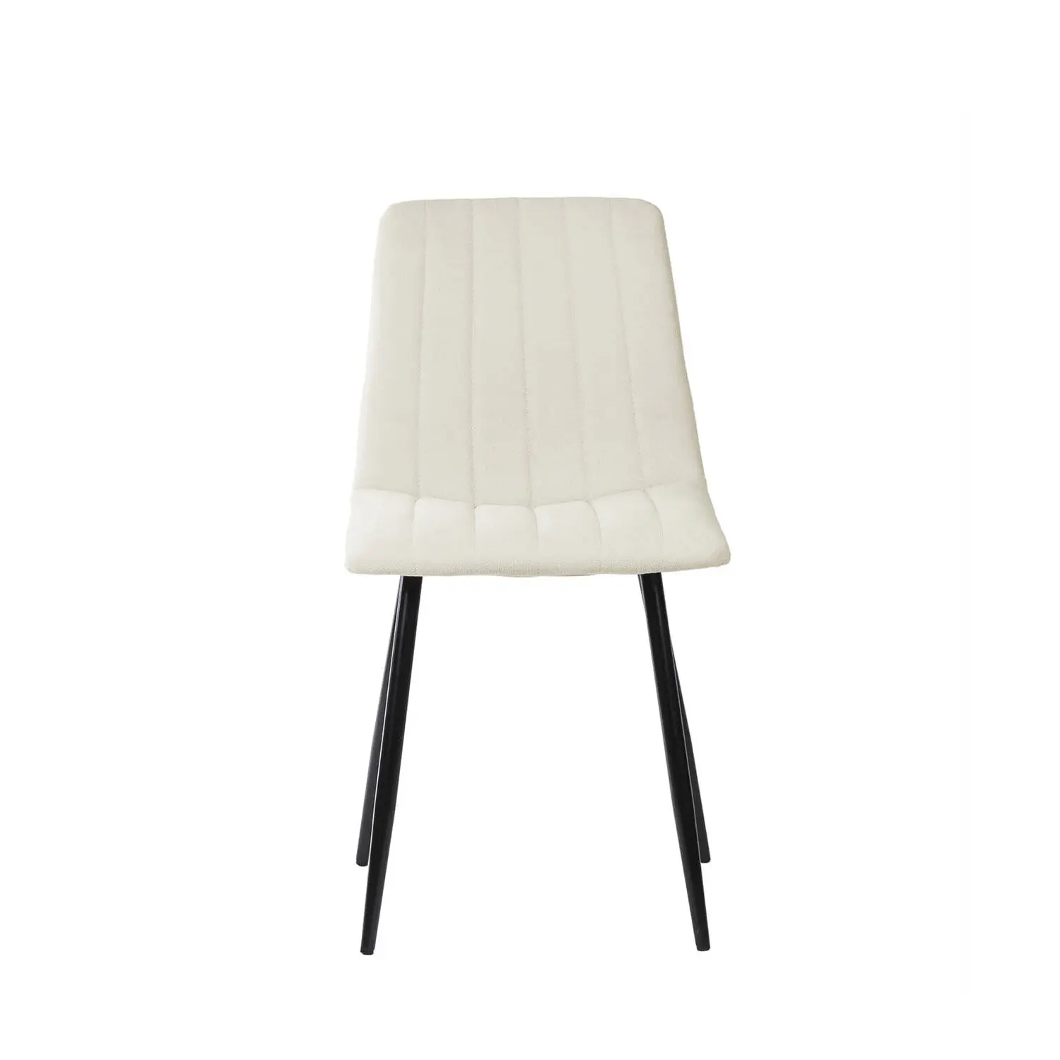 Silla metálica de diseño minimalista y elegante. El asiento y el respaldo están acolchados y presentan un tapizado en tela beige con costuras verticales que crean una textura acanalada, añadiendo tanto comodidad como interés visual. El respaldo ligeramente inclinado y el asiento acolchado aseguran una postura cómoda durante largas comidas o reuniones. Las patas metálicas cónicas negras proporcionan un contraste elegante con el color del tapizado, además de garantizar estabilidad y durabilidad. La silla XENA es perfecta para comedores contemporáneos, pero su diseño atemporal permite que se integre bien en oficinas, salas de estar o incluso en espacios comerciales.