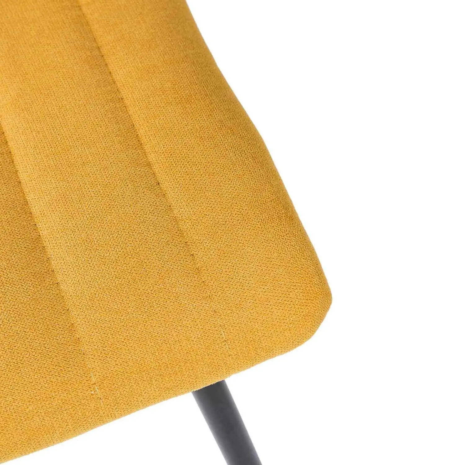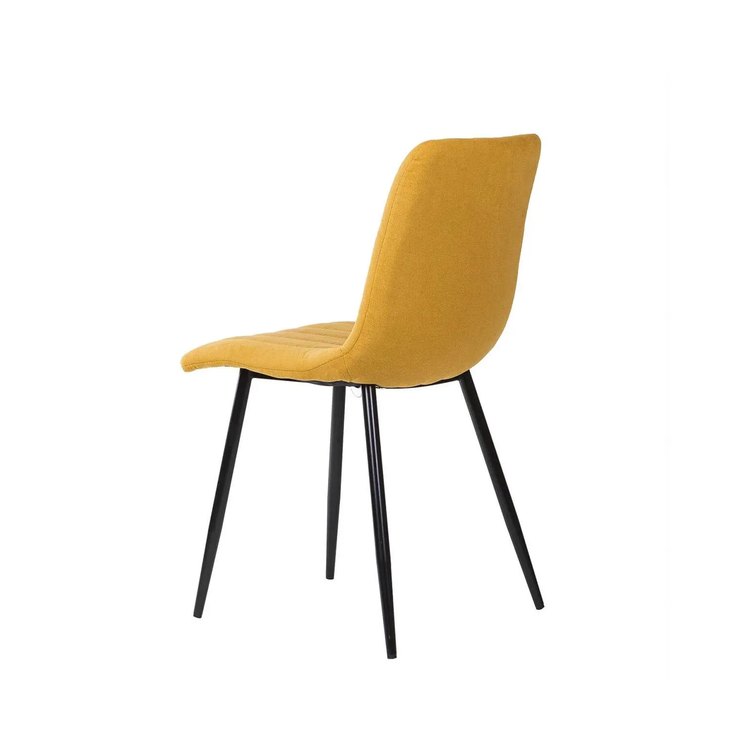 Silla metálica de diseño minimalista y elegante. El asiento y el respaldo están acolchados y presentan un tapizado en tela mostaza con costuras verticales que crean una textura acanalada, añadiendo tanto comodidad como interés visual. El respaldo ligeramente inclinado y el asiento acolchado aseguran una postura cómoda durante largas comidas o reuniones. Las patas metálicas cónicas negras proporcionan un contraste elegante con el color del tapizado, además de garantizar estabilidad y durabilidad. La silla XENA es perfecta para comedores contemporáneos, pero su diseño atemporal permite que se integre bien en oficinas, salas de estar o incluso en espacios comerciales.