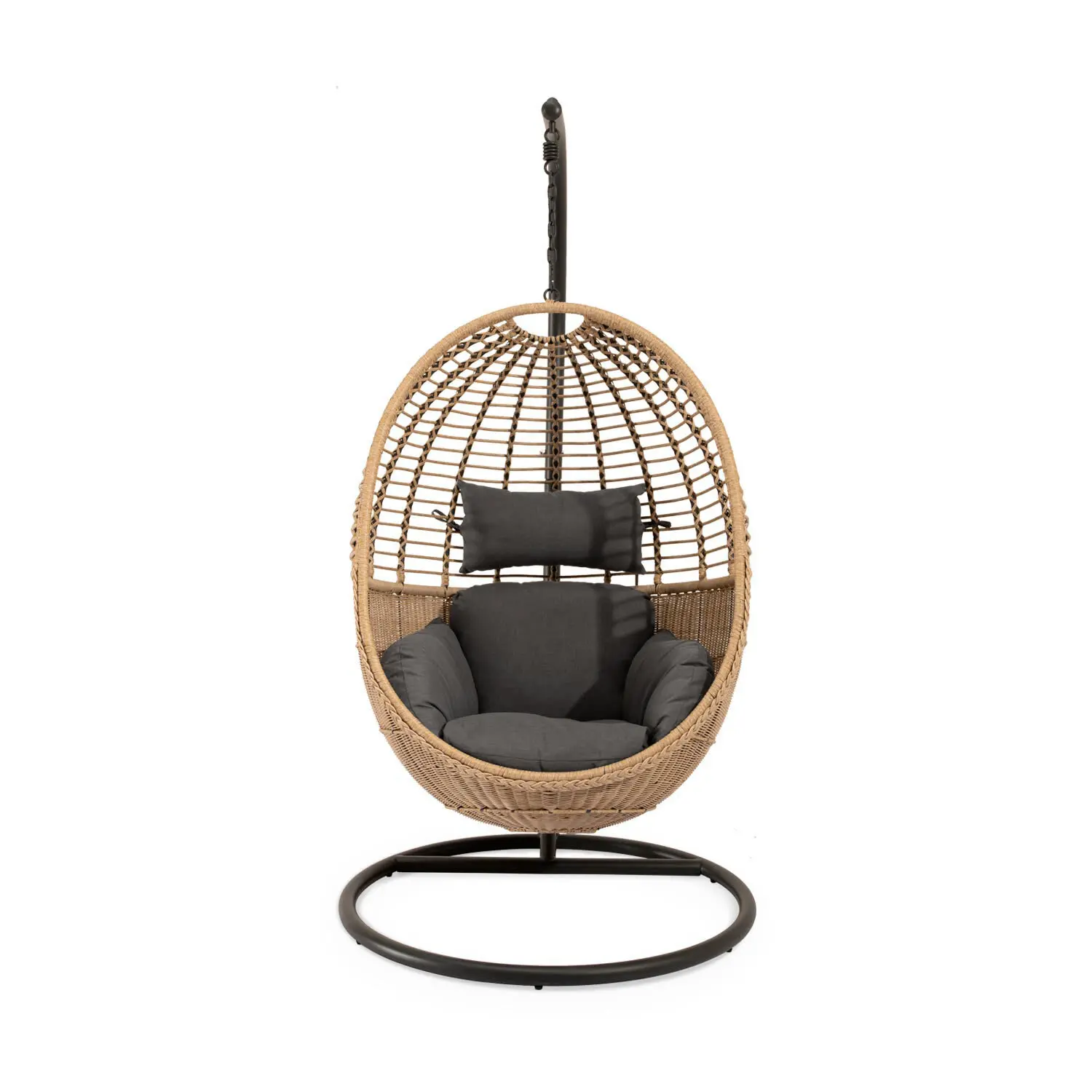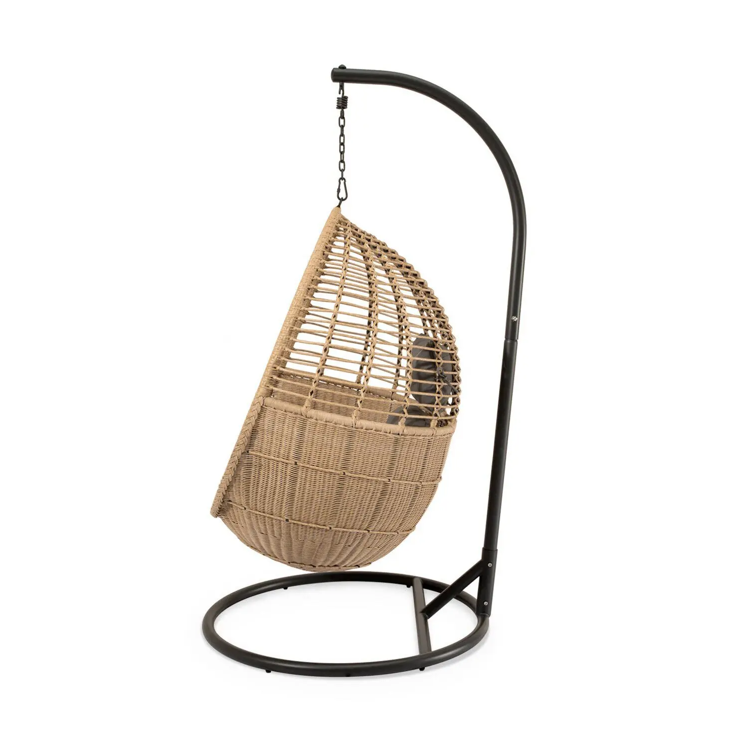 Sumérgete en un ambiente de relajación absoluta con el sillón colgante HANNOVER, donde el diseño contemporáneo se encuentra con la esencia bohemia. Tejido en un ratán sintético de alta calidad, reproduce a la perfección la calidez natural del mimbre, pero con una resistencia excepcional a la intemperie. Su estructura de acero optimizado para entornos al aire libre, no solo aporta un soporte sólido y seguro, sino que eleva la estética del conjunto con su elegante acabado metálico. El diseño envolvente y el cojín acolchado te invitan a dejarte llevar y perderte en tu propio rincón de calma, ya sea en la terraza, jardín o balcón. Además, su estética chic y versátil se adapta a cualquier ambiente, creando un punto focal irresistible.