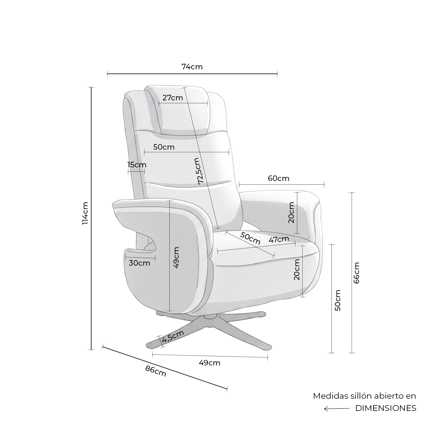 Detalles: | Ancho total: 74 cm | Alto total (cerrado): 114 cm | Alto total (abierto): 85/89 cm | Fondo total (cerrado): 86 cm | Fondo total (abierto): 165 cm | Altura suelo asiento (cerrado): 50 cm | Altura suelo asiento (abierto): 54 cm | Altura suelo brazo (cerrado): 66 cm | Altura suelo reposapiés (abierto): 49 | Altura respaldo: 72,5 cm | Ancho respaldo: 50 cm | Altura brazos: 20 cm | Fondo brazos: 60 cm | Ancho asiento: 47 cm | Fondo asiento: 50 cm | Advertencia tolerancia: +/- 2 cm | Nº paquetes: 1 | Artículos por paquetes: 1 | Dimensión paquete: 89 x 75 x 52 cm | Peso paquete: 35 kg | Manipulación: 2 personas | Tejido: TUAREG/BEIGE | | Características tejido: | -100% POLIÉSTER | -TEST DE ABRASIÓN 40.000 | -OEKO-TEX STANDARD 100 | Motor: 2 ELÉCTRICOS | Elevable: NO | Requiere montaje: SÍ | Peso soportado: 150 kg | Código del producto: 00SF100925 | | | Las imágenes y/o colores de los productos pueden variar ligeramente por motivos de calibrado de pantalla, luz ambiente de la fotografía, ángulo de la misma, remesa producción madera, textil, etc. | Recomendaciones: | | | Uso y mantenimiento: |