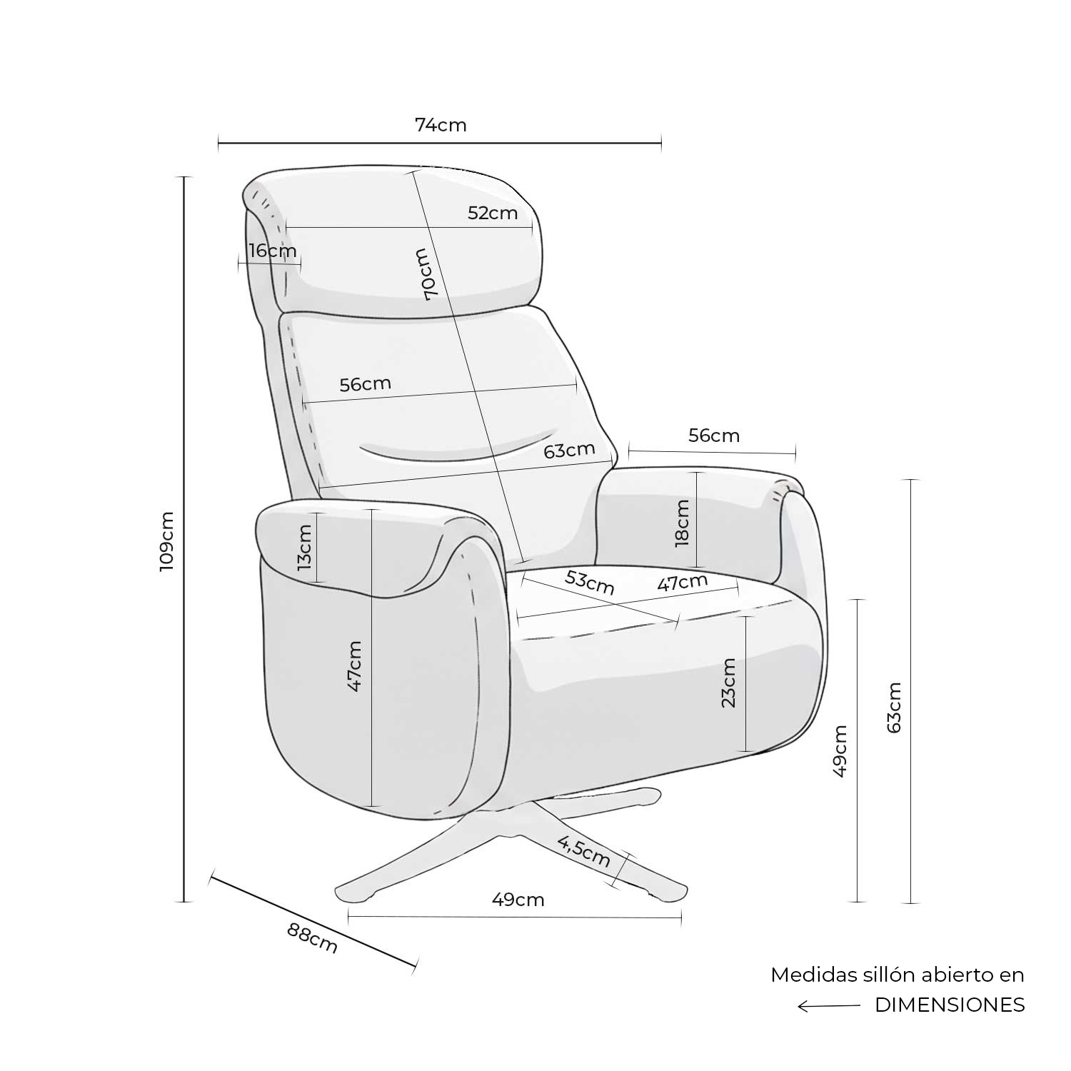Detalles: | Ancho total: 74 cm | Alto total (cerrado): 109 cm | Alto total (abierto): 79/85 cm | Fondo total (cerrado): 88 cm | Fondo total (abierto): 162 cm | Altura suelo asiento (cerrado): 49 cm | Altura suelo asiento (abierto): 52 cm | Altura suelo brazo (cerrado): 63 cm | Altura respaldo: 70 cm | Ancho respaldo: 63 cm | Altura brazos: 18 cm | Fondo brazos: 56 cm | Ancho asiento: 47 cm | Fondo asiento: 53 cm | Advertencia tolerancia: +/- 2 cm | Nº paquetes: 1 | Artículos por paquetes: 1 | Dimensión paquete: 89 x 71 x 52 cm | Peso paquete: 35 kg | Manipulación: 1 persona | Tejido: TUAREG/TAUPE | | Características tejido: | -100% POLIÉSTER | -TEST DE ABRASIÓN 40.000 | -OEKO-TEX STANDARD 100 | Motor: 2 ELÉCTRICOS | Elevable: NO | Requiere montaje: SÍ | Peso soportado: 150 kg | Código del producto: 00SF101030 | | | Las imágenes y/o colores de los productos pueden variar ligeramente por motivos de calibrado de pantalla, luz ambiente de la fotografía, ángulo de la misma, remesa producción madera, textil, etc. | Recomendaciones: | | | Uso y mantenimiento: |