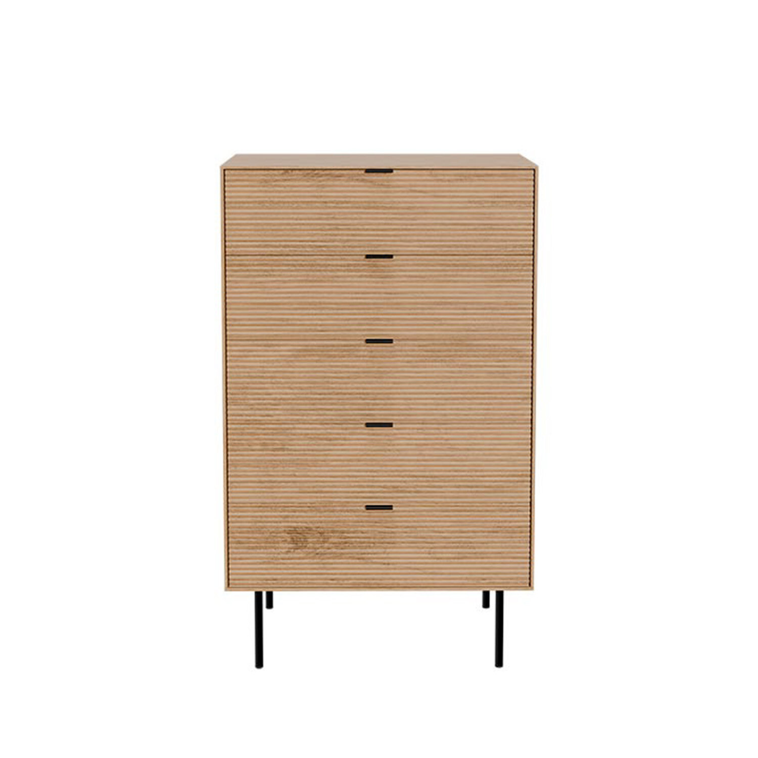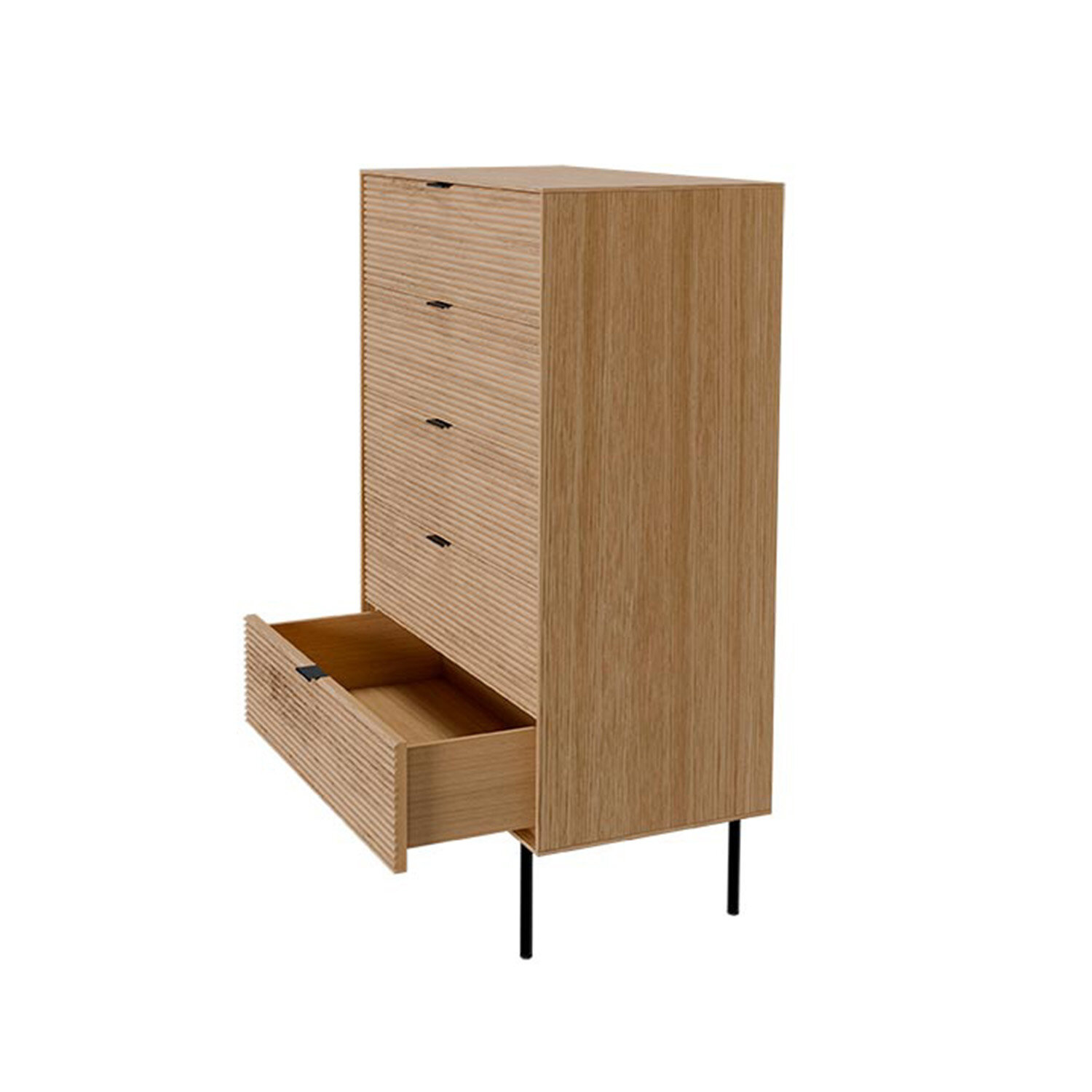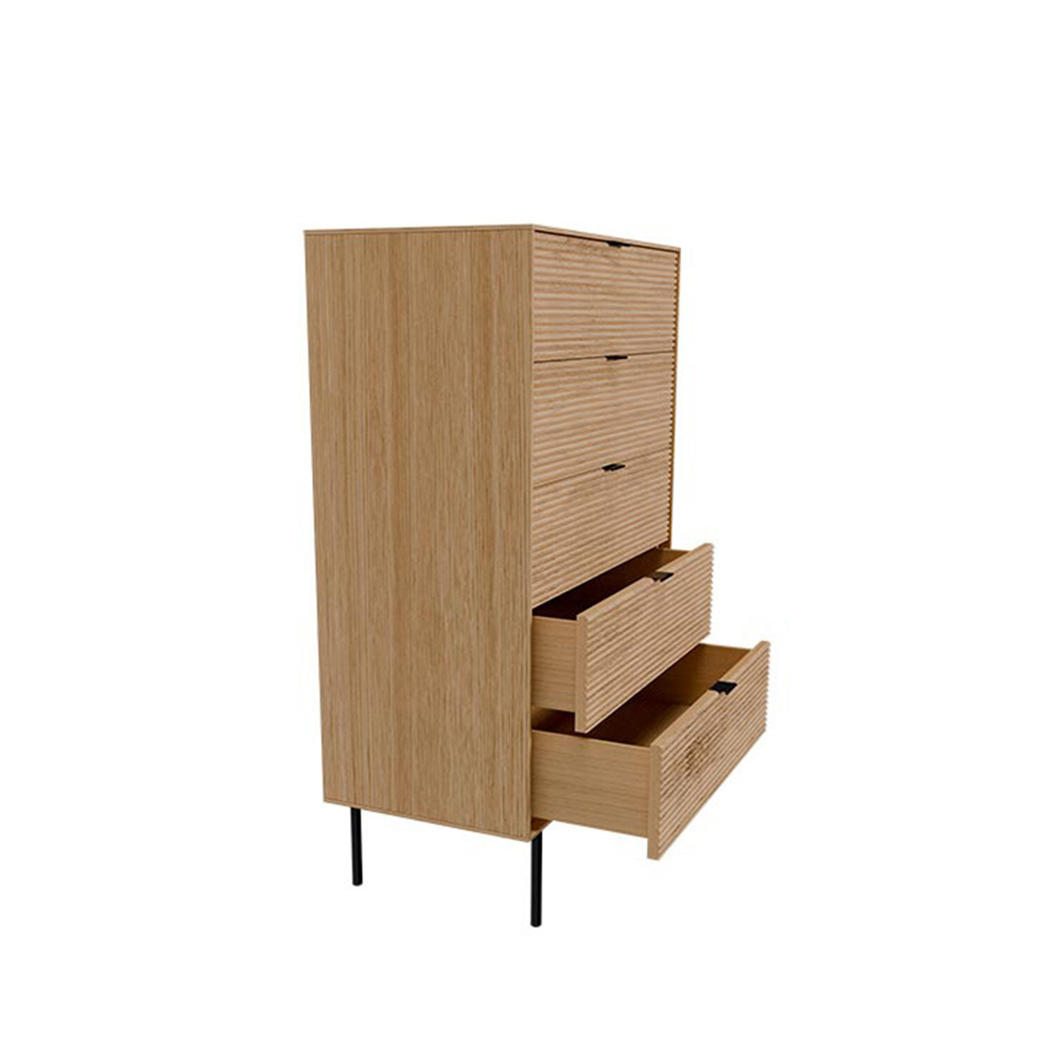 El sinfonier TULSA de cinco cajones es una solución de almacenaje vertical que maximiza el espacio con estilo. Su diseño esbelto y funcional lo hace ideal para dormitorios con estética cuidada y necesidad de orden. Con estructura en chapa de roble y frentes en madera maciza rayada, aporta calidez natural. Los tiradores y patas metálicas en negro, junto al sistema soft closing , completan una pieza práctica con acento contemporáneo.
