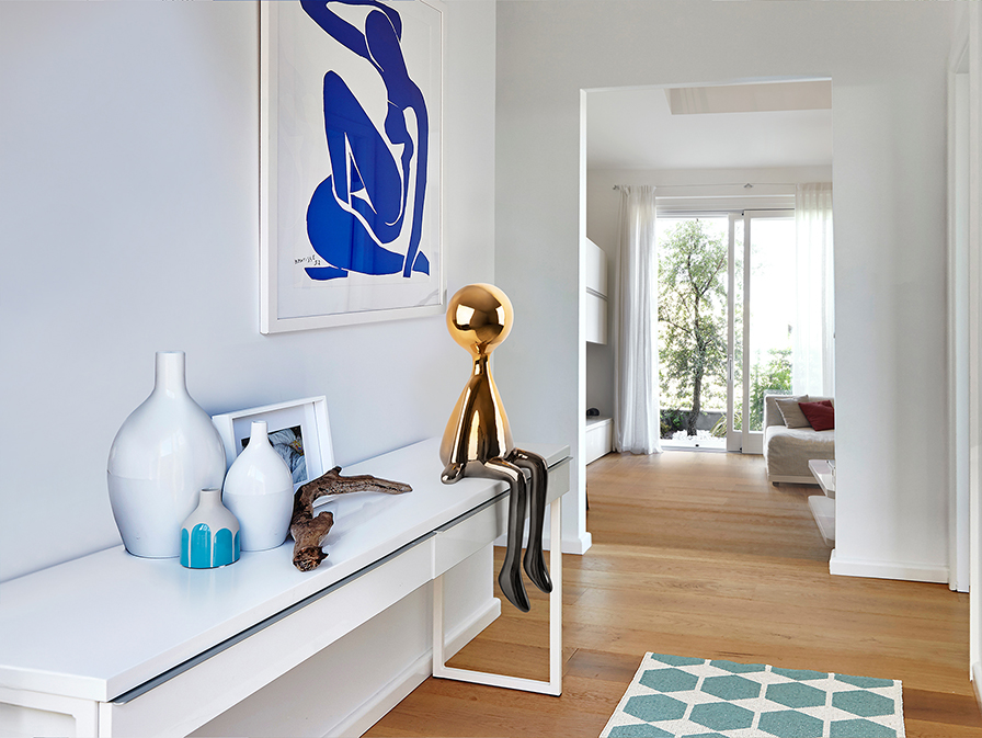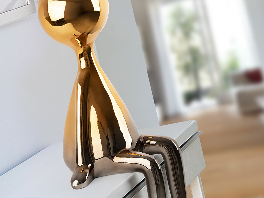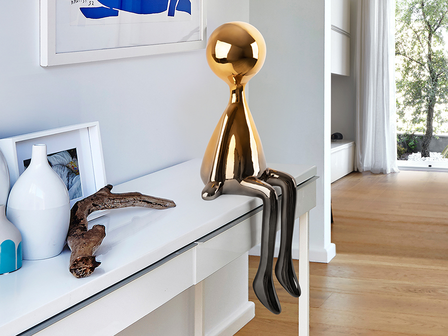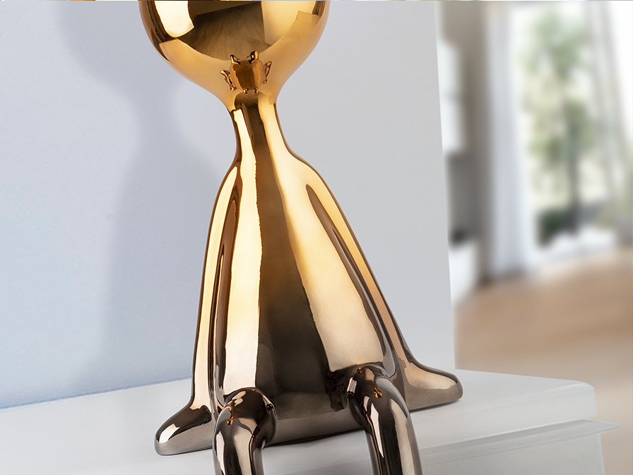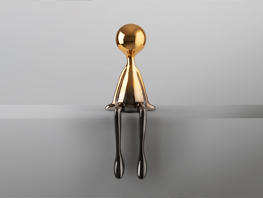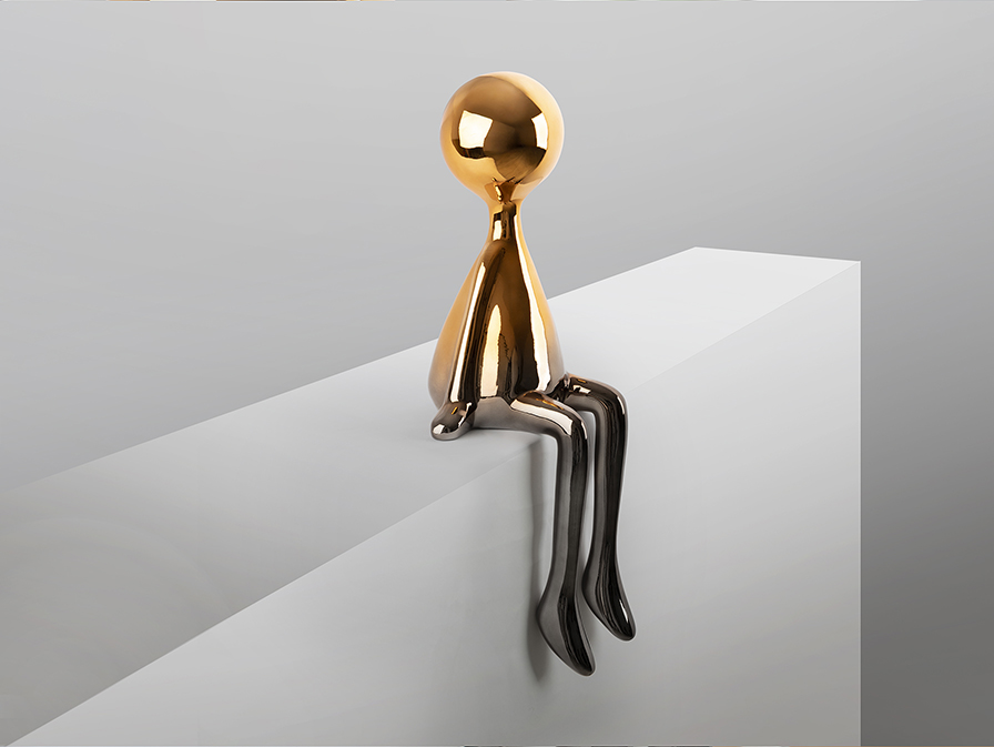 Figura sedente, tamaño mediano. Realizada en resina, acabado metalizado degradado de gris plomo a naranja.