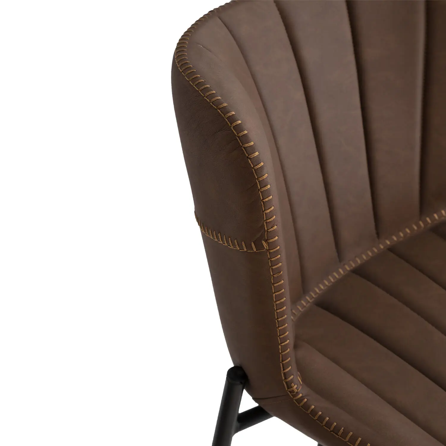 Este elegante taburete bajo combina lo mejor del diseño moderno y clásico. Su asiento, tapizado en polipiel marrón con un efecto que imita la piel auténtica, presenta un atractivo ribeteado, añadiendo textura y sofisticación. La estructura y las patas del taburete alto JONAS están fabricadas en metal con un acabado negro mate, proporcionando un soporte robusto y estilizado. Además, cuenta con reposapiés integrado para mayor comodidad.