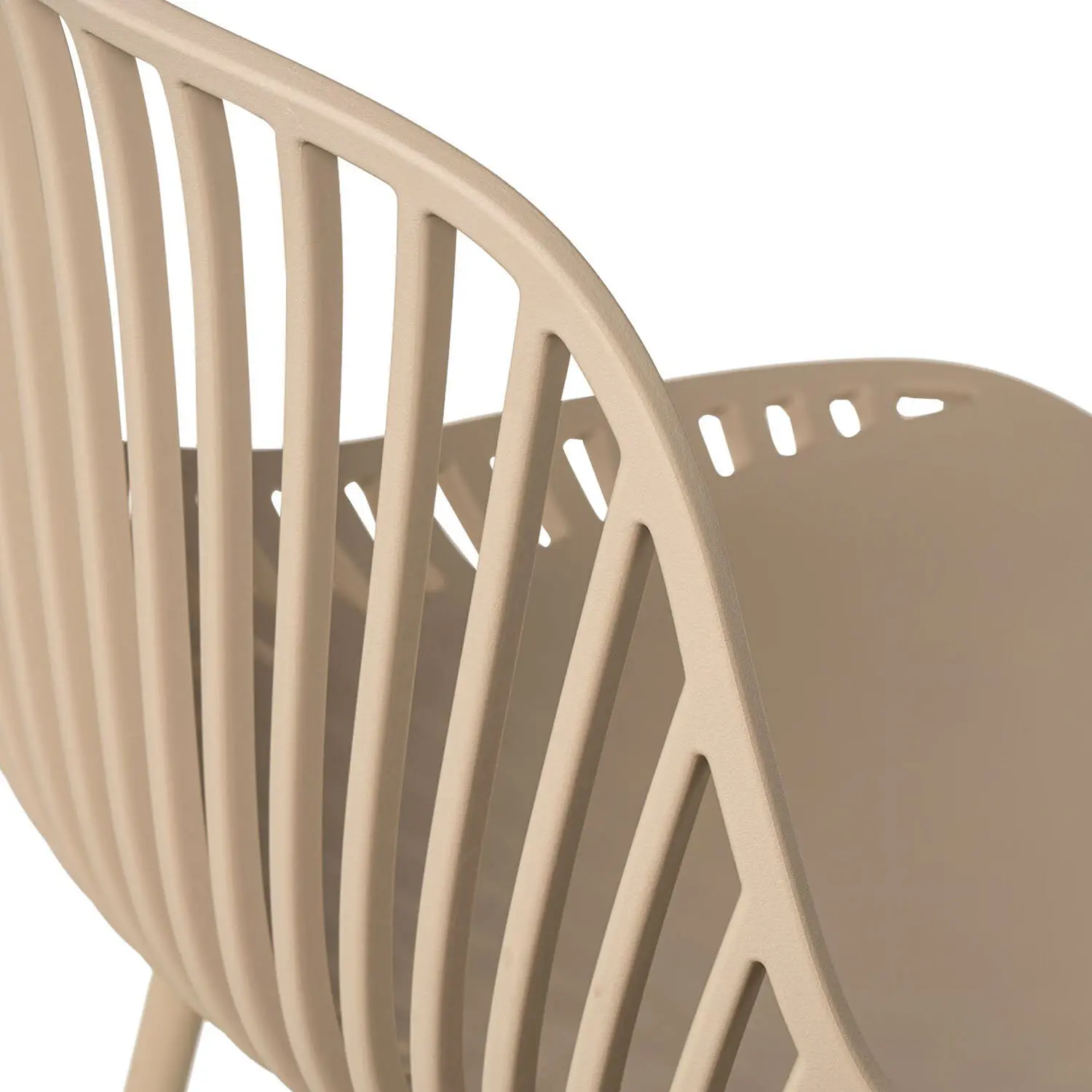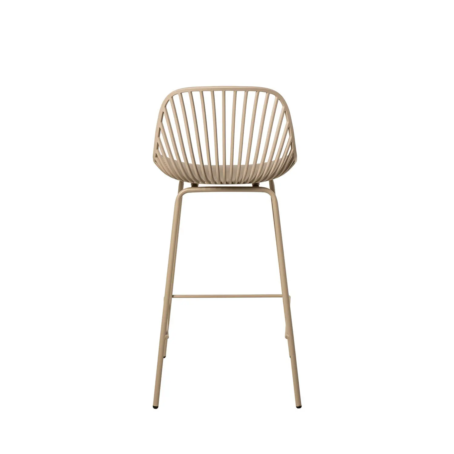 El taburete bajo PEYTON destaca por su diseño original, con un respaldo abierto compuesto por pequeñas barras verticales y un asiento de polipropileno en color beige, todo en una misma pieza. Sus patas, de metal lacado en mate, incluyen un reposapiés que proporciona mayor estabilidad y comodidad. Este taburete es perfecto para cualquier ambiente, gracias a su estilo moderno y versátil. Descubre su versión alta: CASPER .