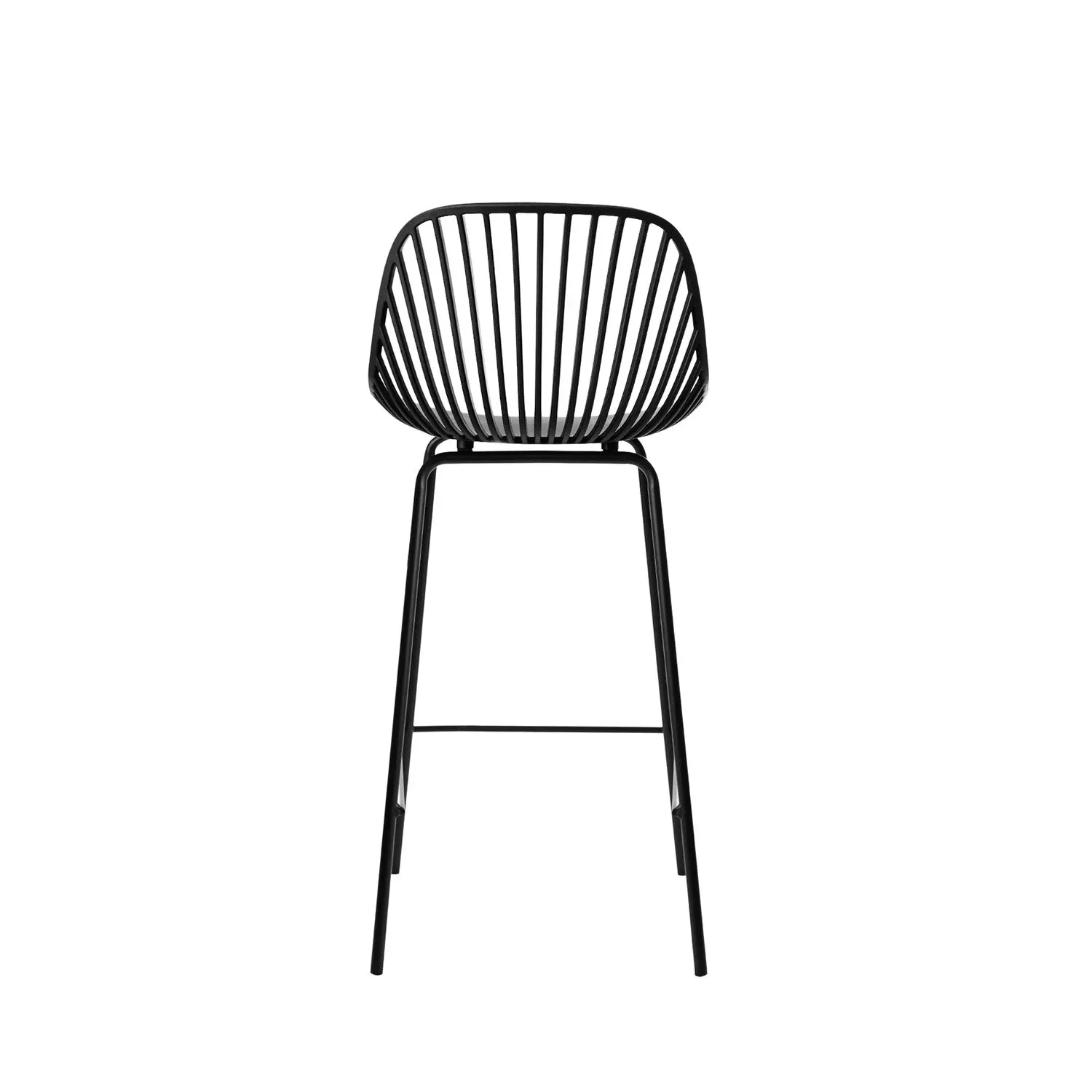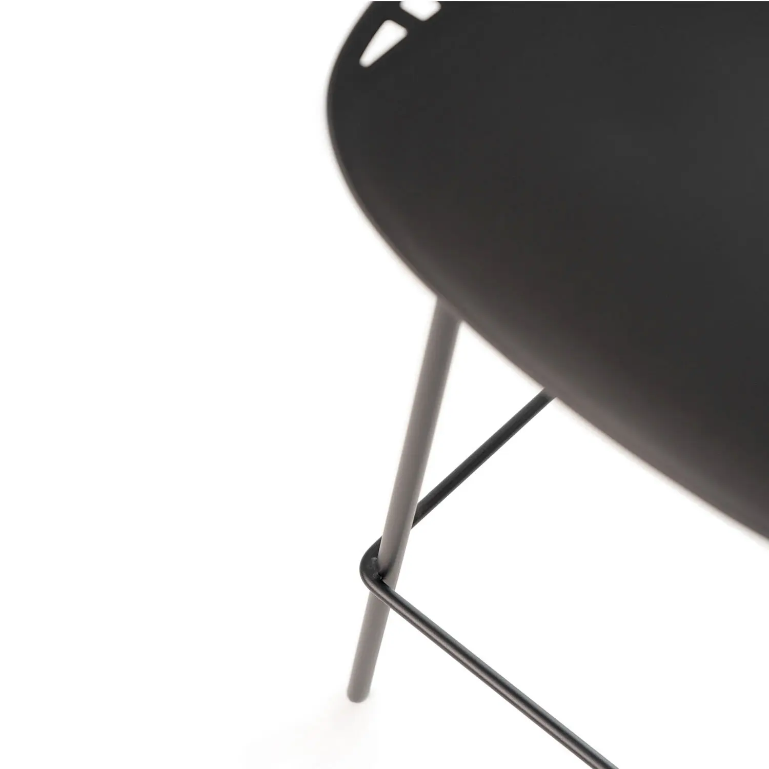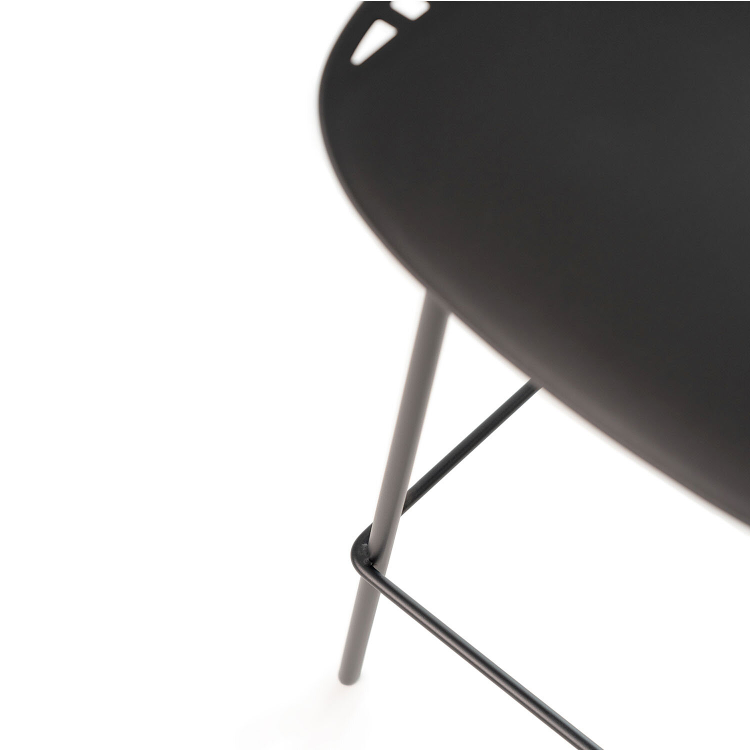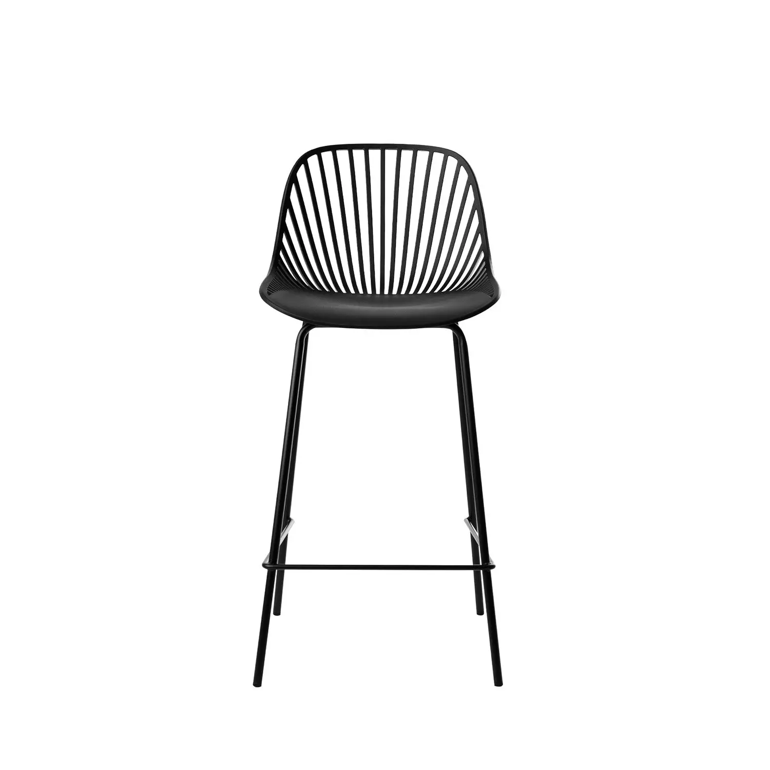 El taburete bajo PEYTON destaca por su diseño original, con un respaldo abierto compuesto por pequeñas barras verticales y un asiento de polipropileno en color negro, todo en una misma pieza. Sus patas, de metal lacado en mate, incluyen un reposapiés que proporciona mayor estabilidad y comodidad. Este taburete es perfecto para cualquier ambiente, gracias a su estilo moderno y versátil. Descubre su versión alta: CASPER .