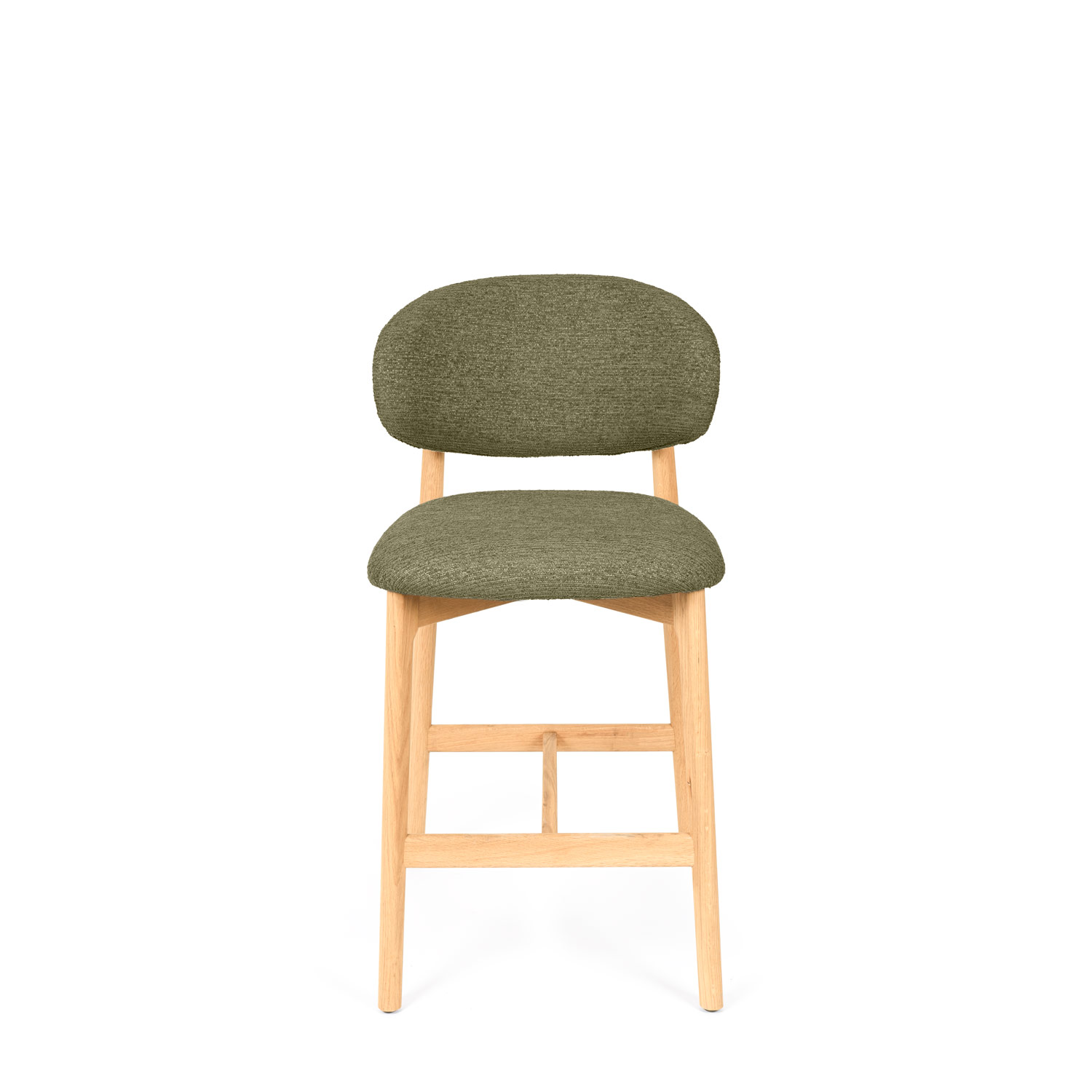 El taburete RENZO destaca por su equilibrio entre diseño, confort y estructura. Su base en madera de haya aporta solidez y calidez visual, mientras que las patas, ligeramente cónicas y unidas por travesaños en cruz, refuerzan la estabilidad y le otorgan un carácter artesanal muy cuidado. Está disponible en tonos beige, verde y taupe, y uno de sus mayores atractivos es la estructura trasera en madera vista, que enmarca el respaldo con elegancia y se convierte en un detalle distintivo cuando se observa desde cualquier ángulo. Este diseño, pensado para cocinas con isla, barras o espacios de hostelería, combina funcionalidad con una presencia decorativa que no pasa desapercibida. Además, RENZO ha sido concebido para ir a juego con la silla WANDA, creando una pareja perfecta que aporta coherencia y armonía a los espacios que exigen diseño y equilibrio en cada detalle.