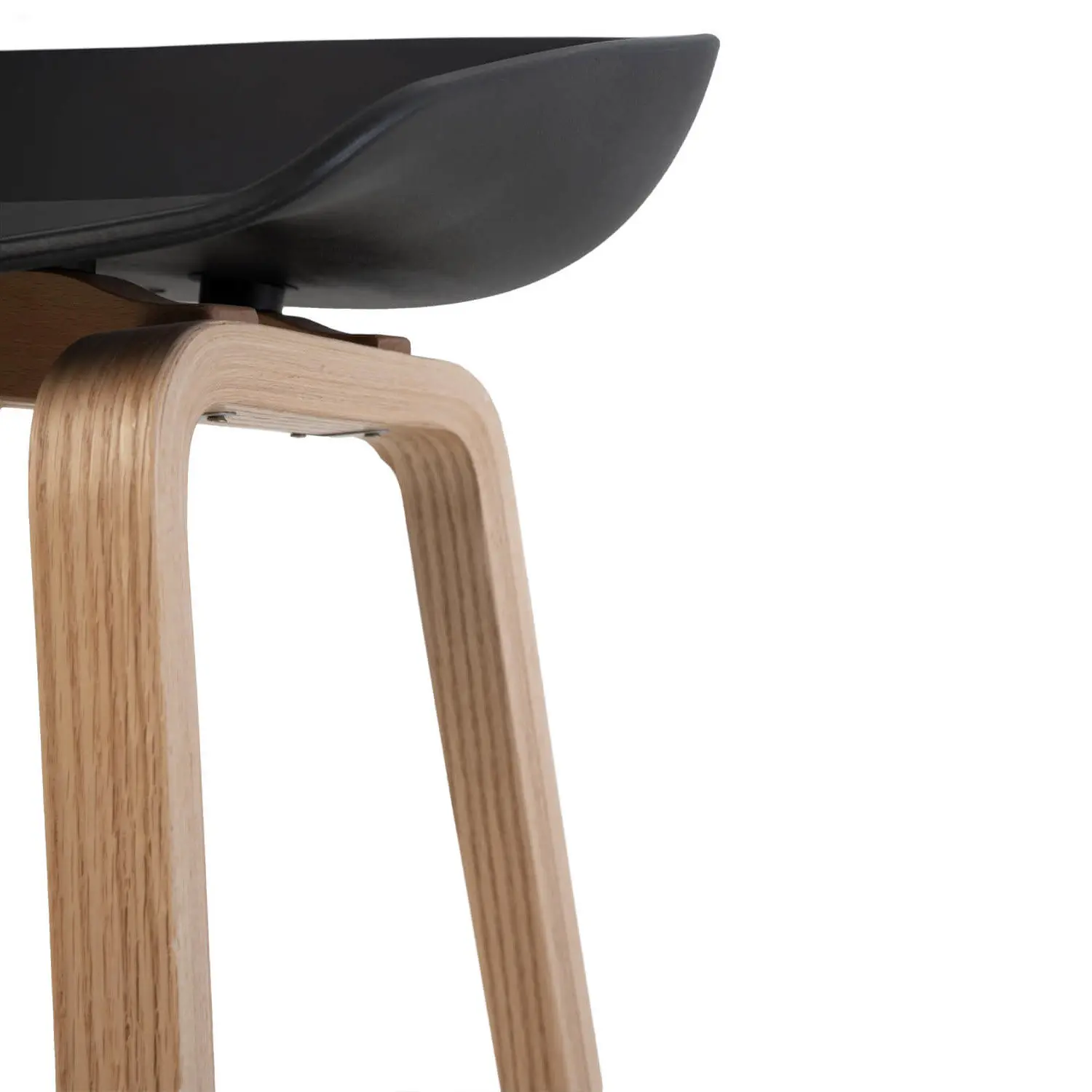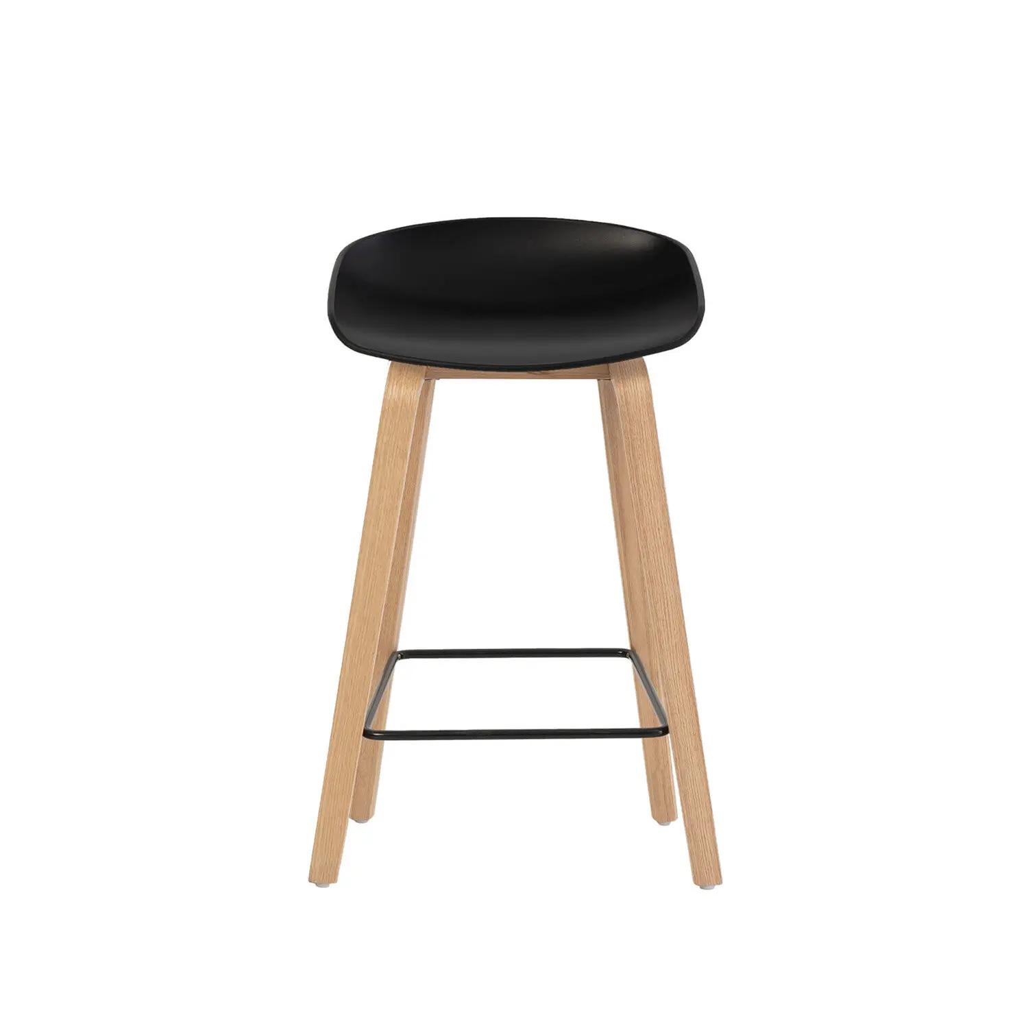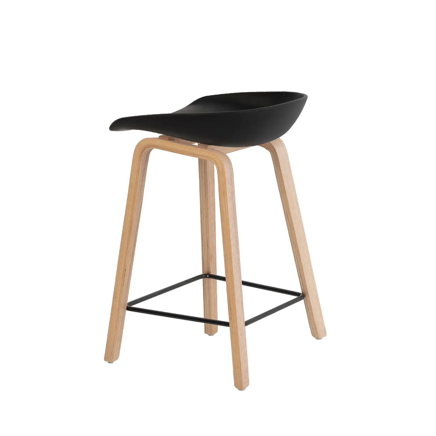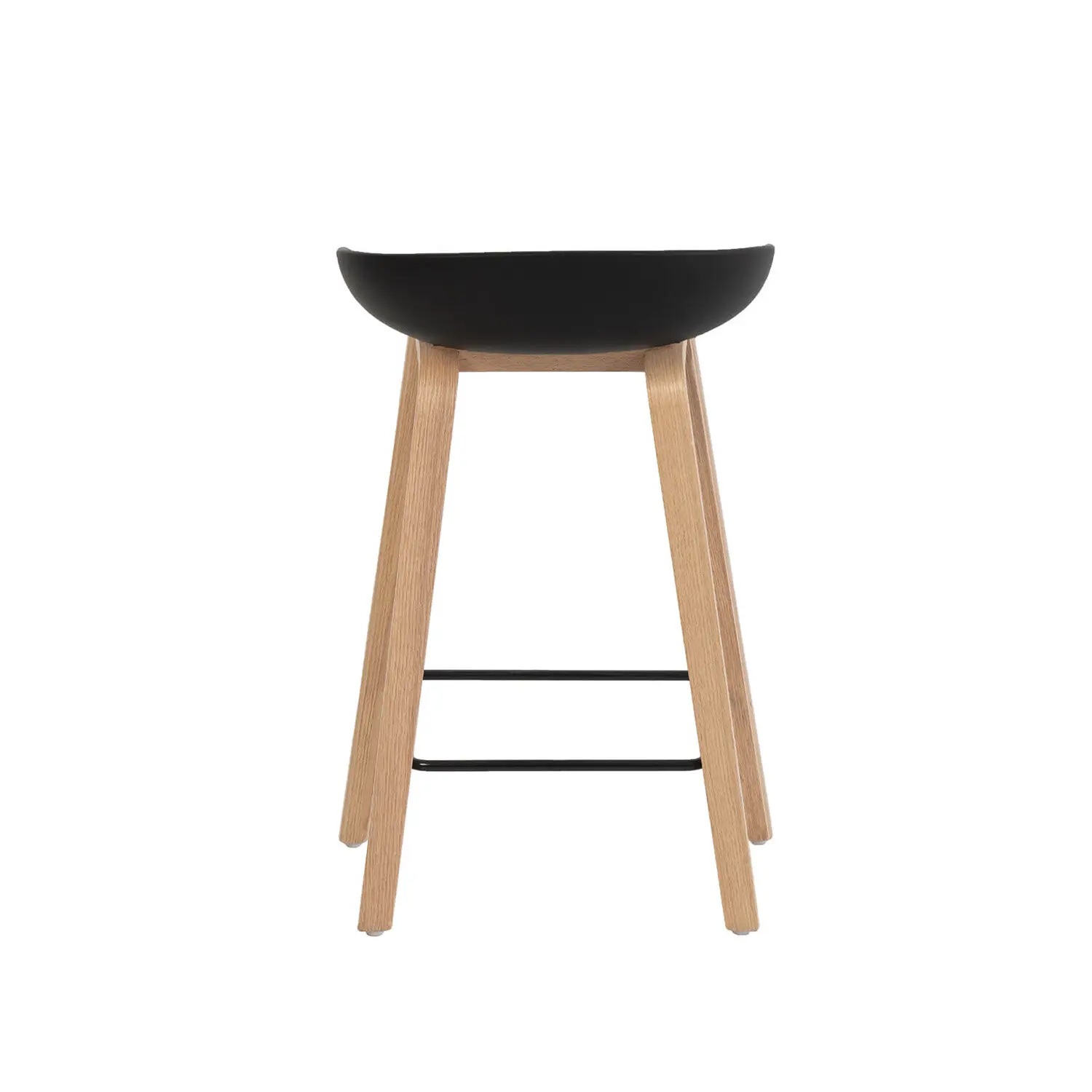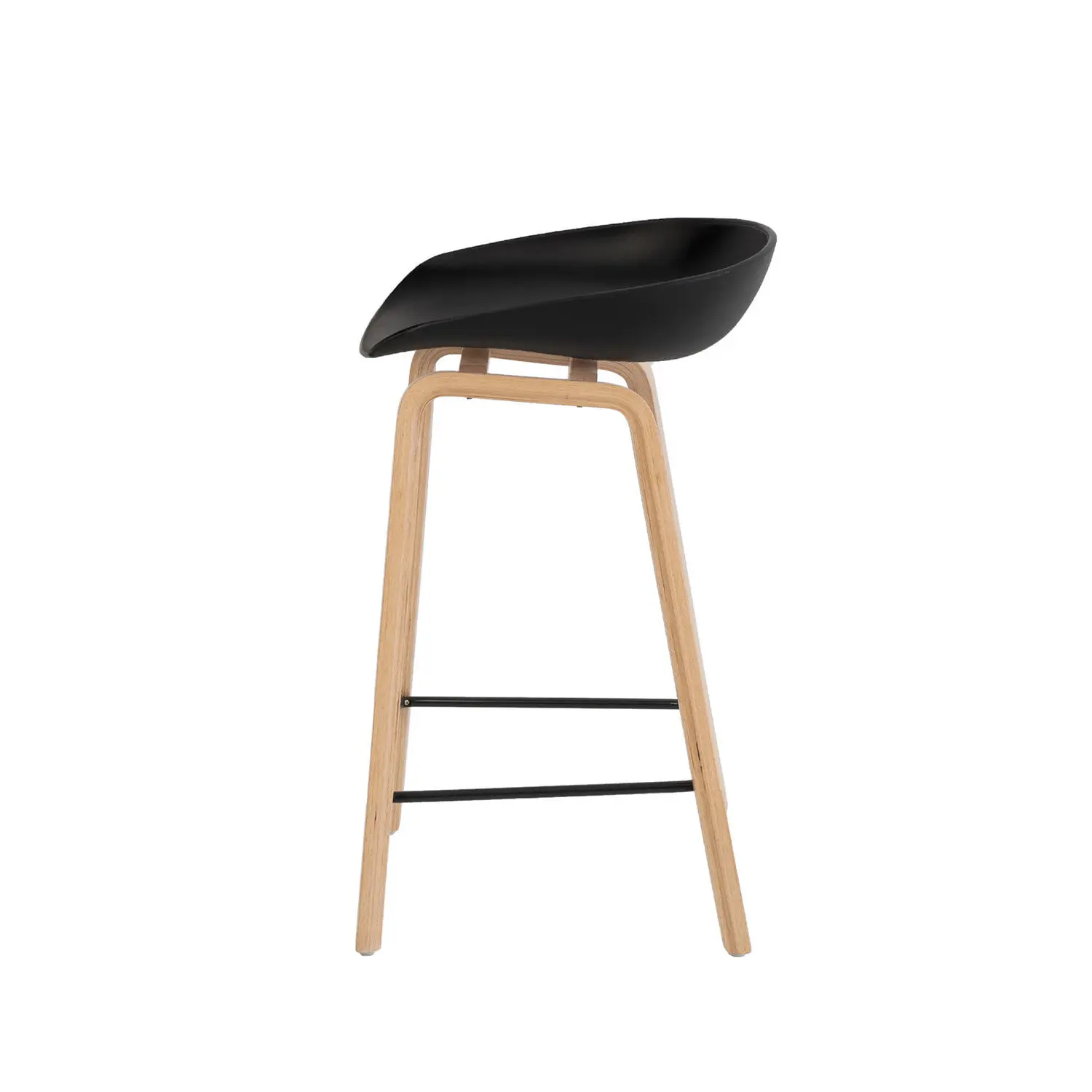 El taburete bajo RUTH destaca por su diseño sencillo pero moderno. Está compuesto por una única pieza de polipropileno duradero en color negro, ligeramente cóncava, que forma tanto el asiento como el respaldo. El contraste con las patas de madera en forma de ‘U’ invertida y el reposapiés metálico en negro le confiere un toque elegante, además de proporcionar un soporte robusto y estable. Descubre su versión alta: RONIE .