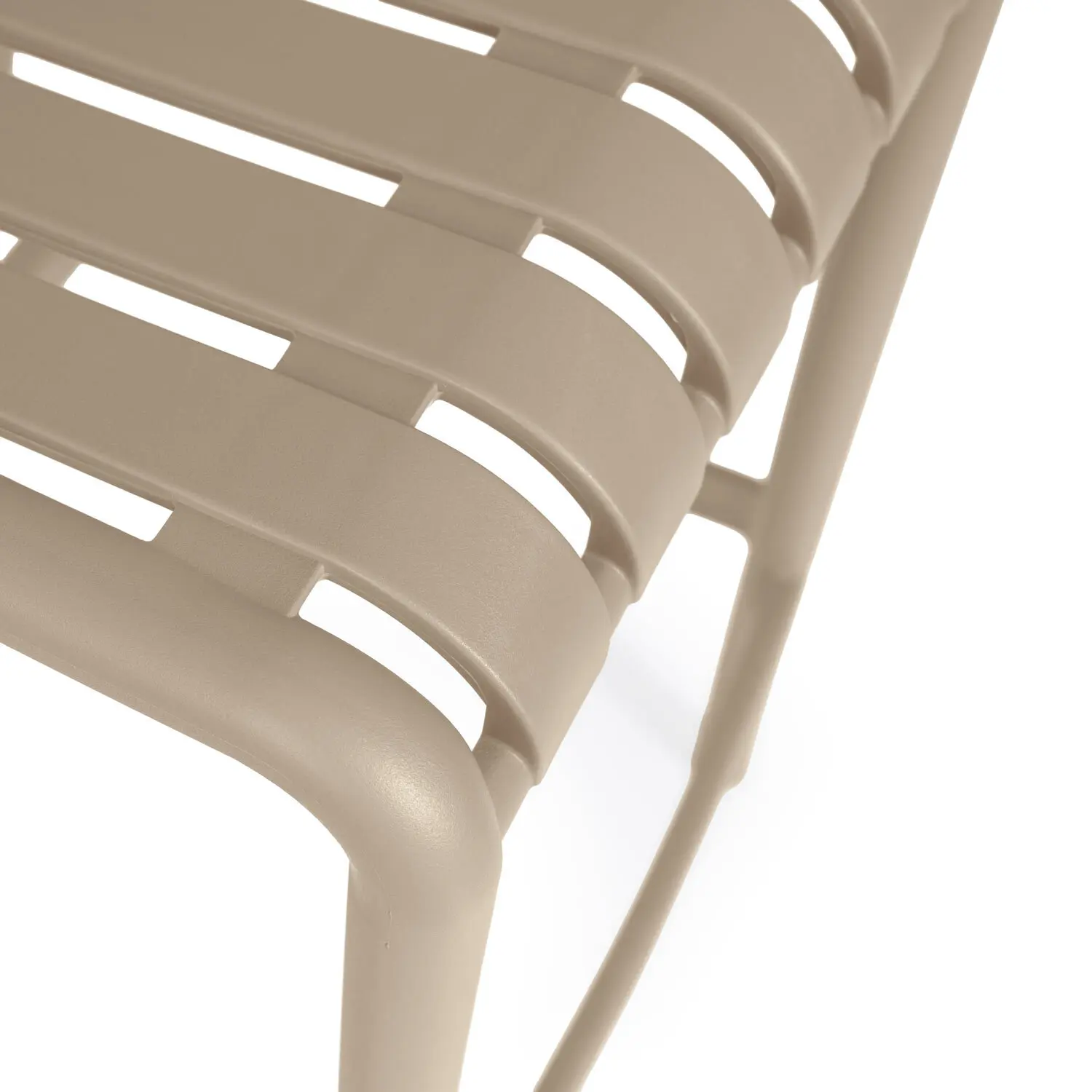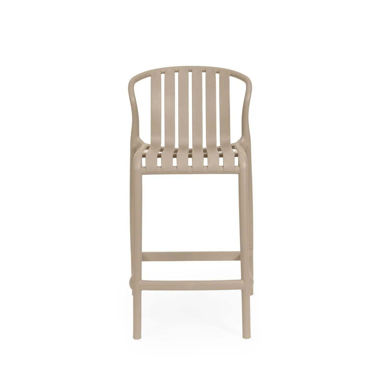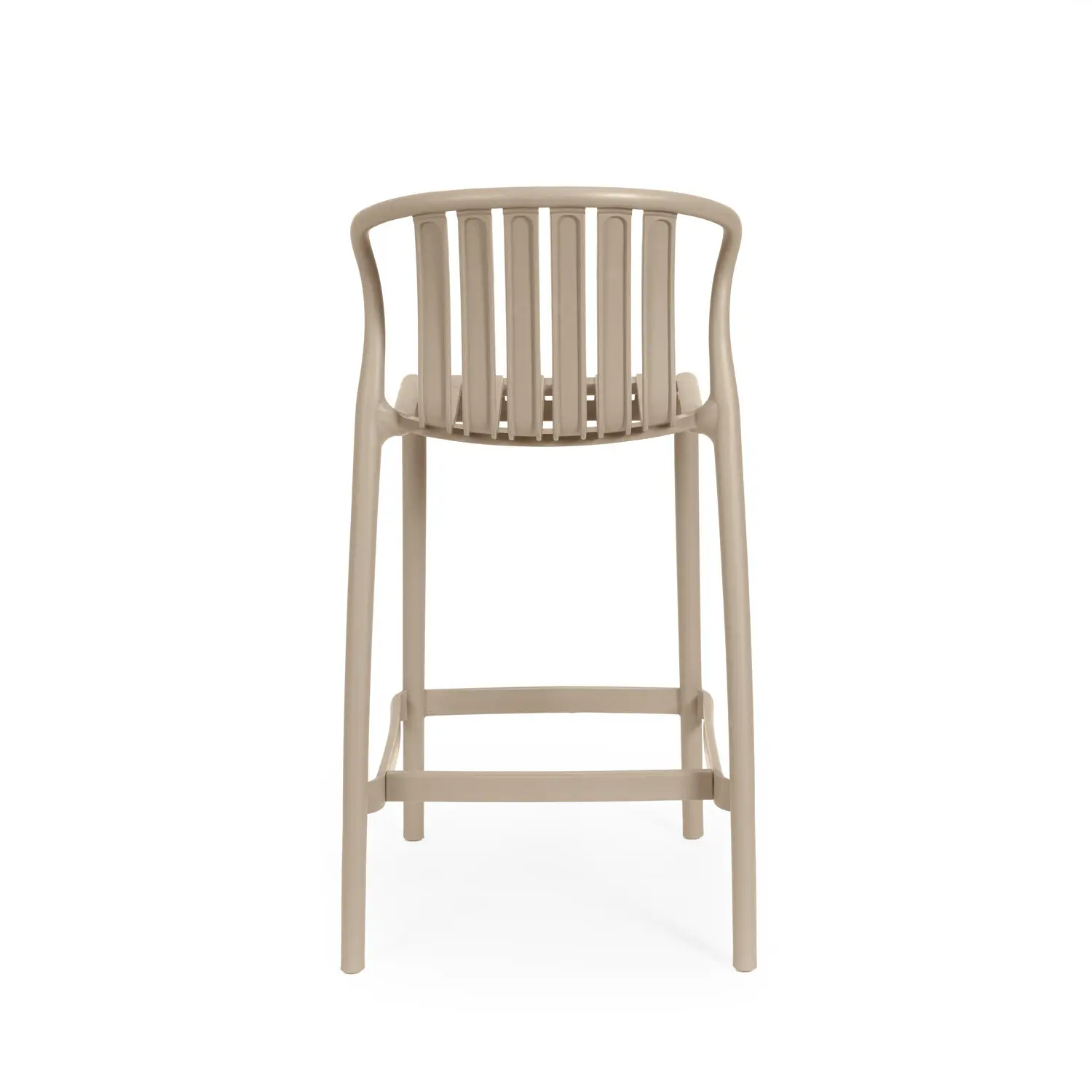 El taburete BASTIAN destaca por su diseño ligero y envolvente, fabricado en resistente polipropileno. Su asiento curvado y ergonómico, con lamas ligeramente separadas, favorece la ventilación y la comodidad incluso en usos prolongados. El respaldo, de líneas suaves y continuidad fluida con la estructura, ofrece un soporte firme sin sacrificar ligereza visual. Disponible en cinco colores actuales —negro, blanco, beige, verde y terracota—, BASTIAN se adapta con naturalidad a cocinas, barras o espacios contract, aportando estilo y funcionalidad en ambientes tanto interiores como semicubiertos.