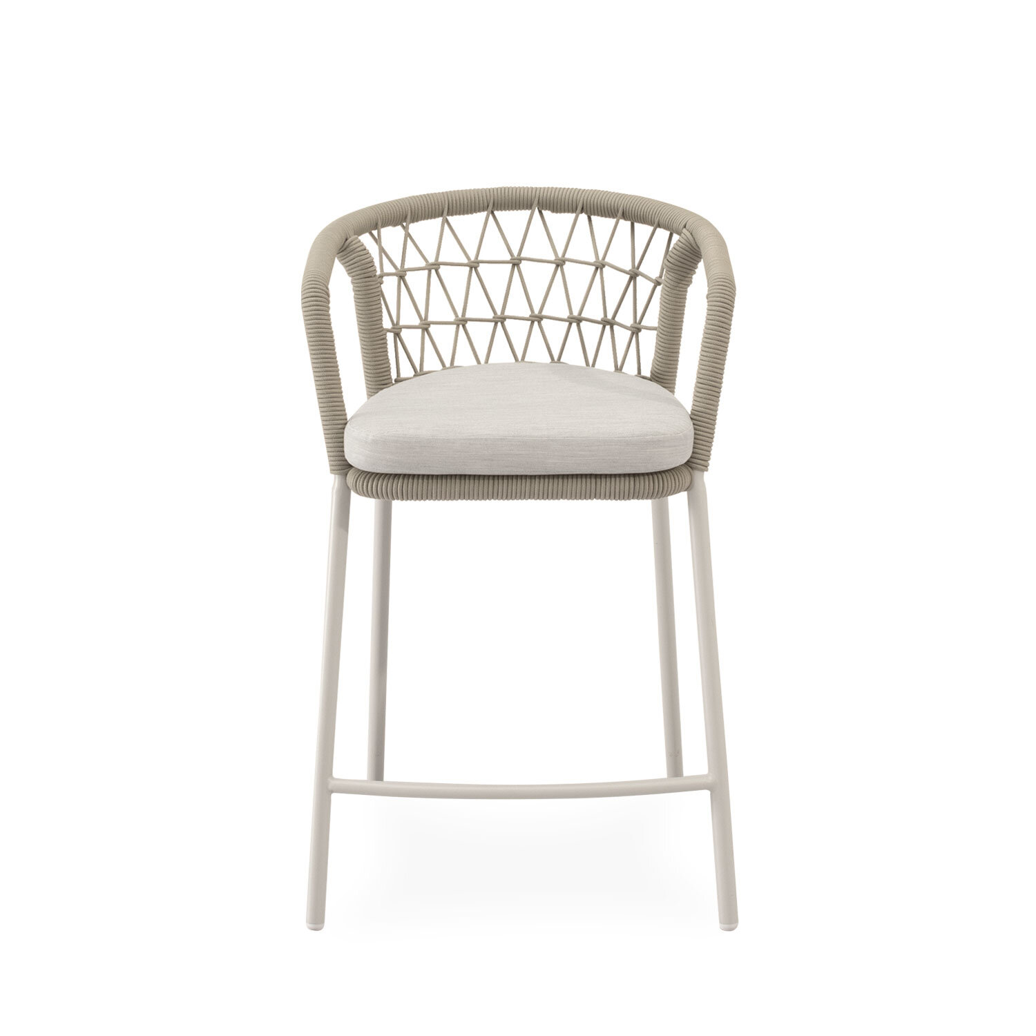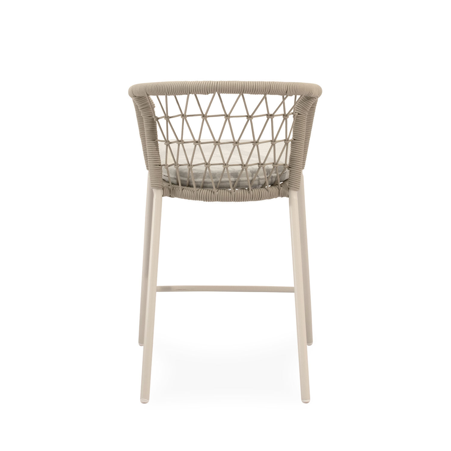 El taburete EDWIN combina elegancia y comodidad con un diseño pensado para destacar. Su respaldo curvo, envuelto en cuerda entrelazada, aporta un sutil toque decorativo mientras proporciona un soporte ergonómico que envuelve suavemente la espalda. Las patas de acero cuidadosamente tratado para uso prolongado en exteriores, robustas y ligeramente inclinadas, garantizan estabilidad y un contraste moderno con el asiento acolchado en poliéster. EDWIN es ideal para crear rincones sofisticados en terrazas, barras exteriores o zonas de comedor con un aire contemporáneo.