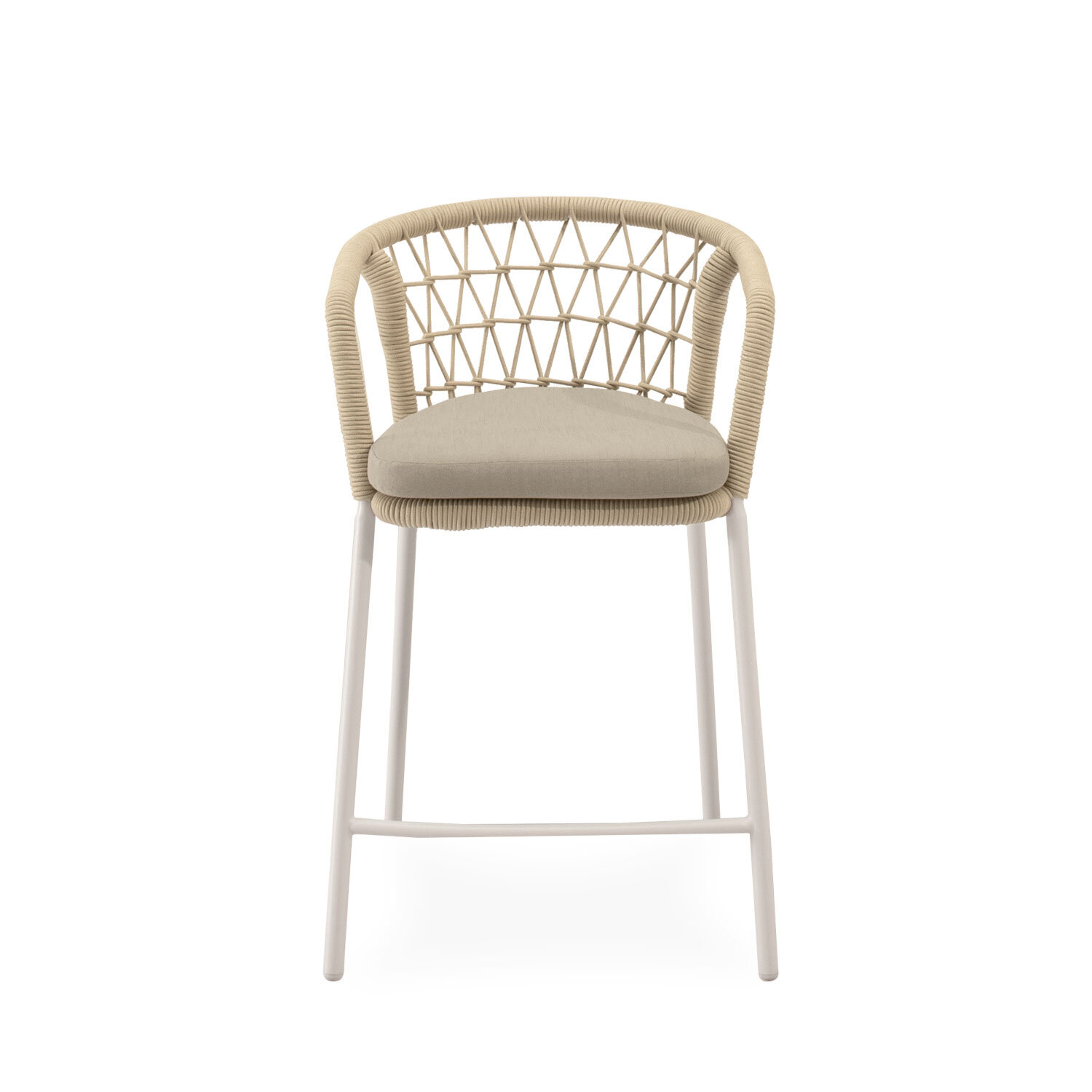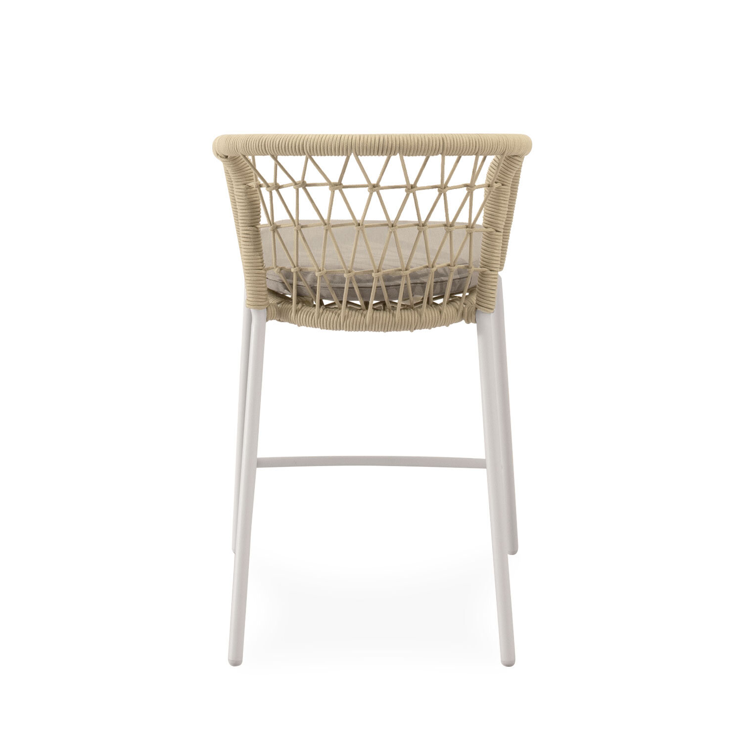 El taburete EDWIN combina elegancia y comodidad con un diseño pensado para destacar. Su respaldo curvo, envuelto en cuerda entrelazada, aporta un sutil toque decorativo mientras proporciona un soporte ergonómico que envuelve suavemente la espalda. Las patas de acero cuidadosamente tratado para uso prolongado en exteriores, robustas y ligeramente inclinadas, garantizan estabilidad y un contraste moderno con el asiento acolchado en poliéster. EDWIN es ideal para crear rincones sofisticados en terrazas, barras exteriores o zonas de comedor con un aire contemporáneo.