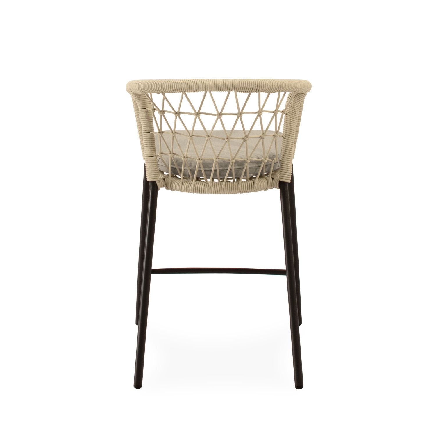 El taburete EDWIN combina elegancia y comodidad con un diseño pensado para destacar. Su respaldo curvo, envuelto en cuerda entrelazada, aporta un sutil toque decorativo mientras proporciona un soporte ergonómico que envuelve suavemente la espalda. Las patas de acero cuidadosamente tratado para uso prolongado en exteriores, robustas y ligeramente inclinadas, garantizan estabilidad y un contraste moderno con el asiento acolchado en poliéster. EDWIN es ideal para crear rincones sofisticados en terrazas, barras exteriores o zonas de comedor con un aire contemporáneo.