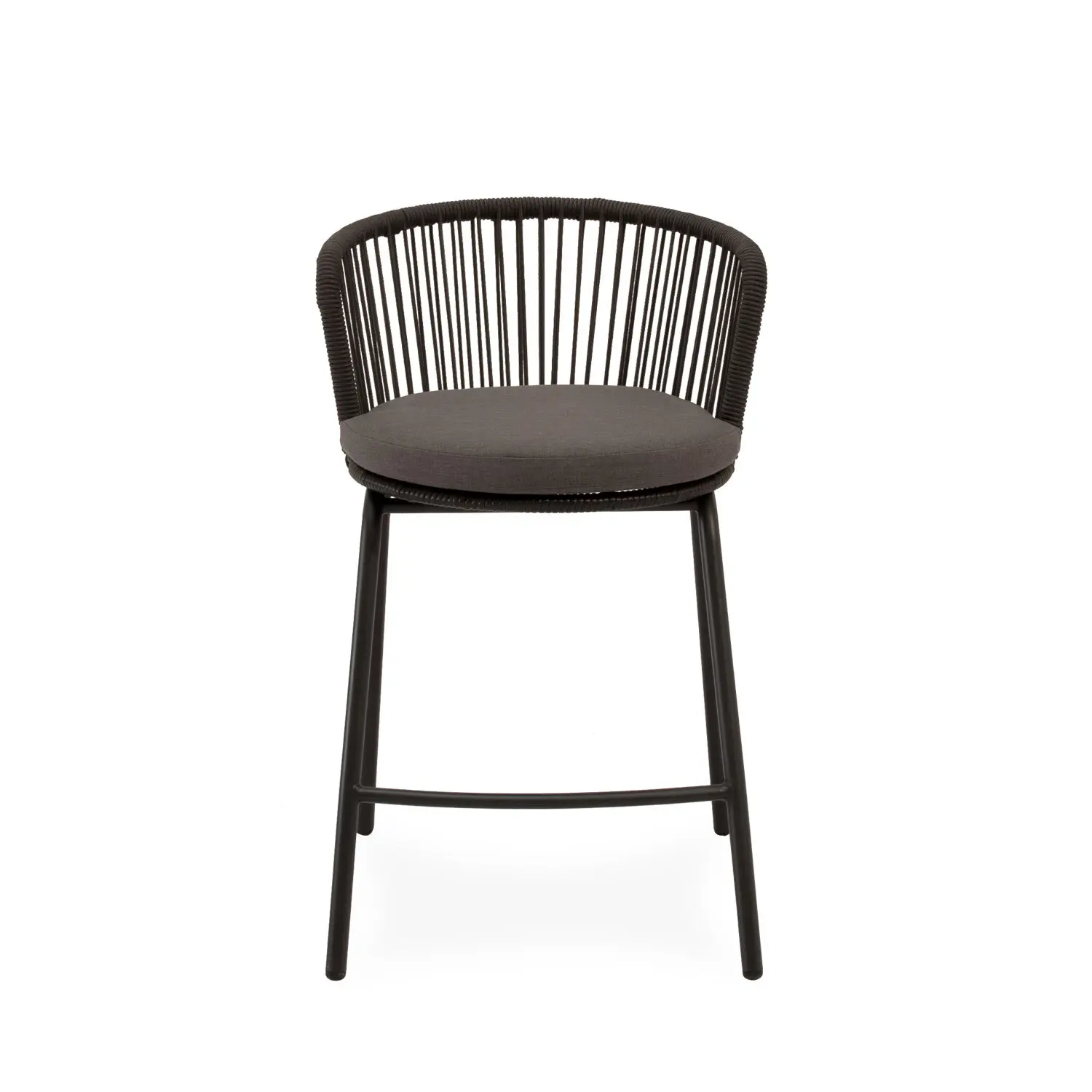 El taburete PIERRE combina un estilo contemporáneo con un diseño pensado para aportar comodidad y frescura a cualquier espacio exterior. Su respaldo curvo, elaborado en cuerda resistente, presenta un entramado lineal que crea un efecto visual ligero y dinámico. Esta estructura no solo envuelve suavemente la espalda, sino que también permite una ventilación natural, perfecta para los días más cálidos. Las patas de acero especialmente acondicionado para exteriores, añaden estabilidad y un toque moderno, mientras que el asiento acolchado en poliéster proporciona el confort necesario para largas tertulias al aire libre. PIERRE se integra fácilmente en terrazas, barras y jardines, convirtiéndose en una opción versátil y funcional.