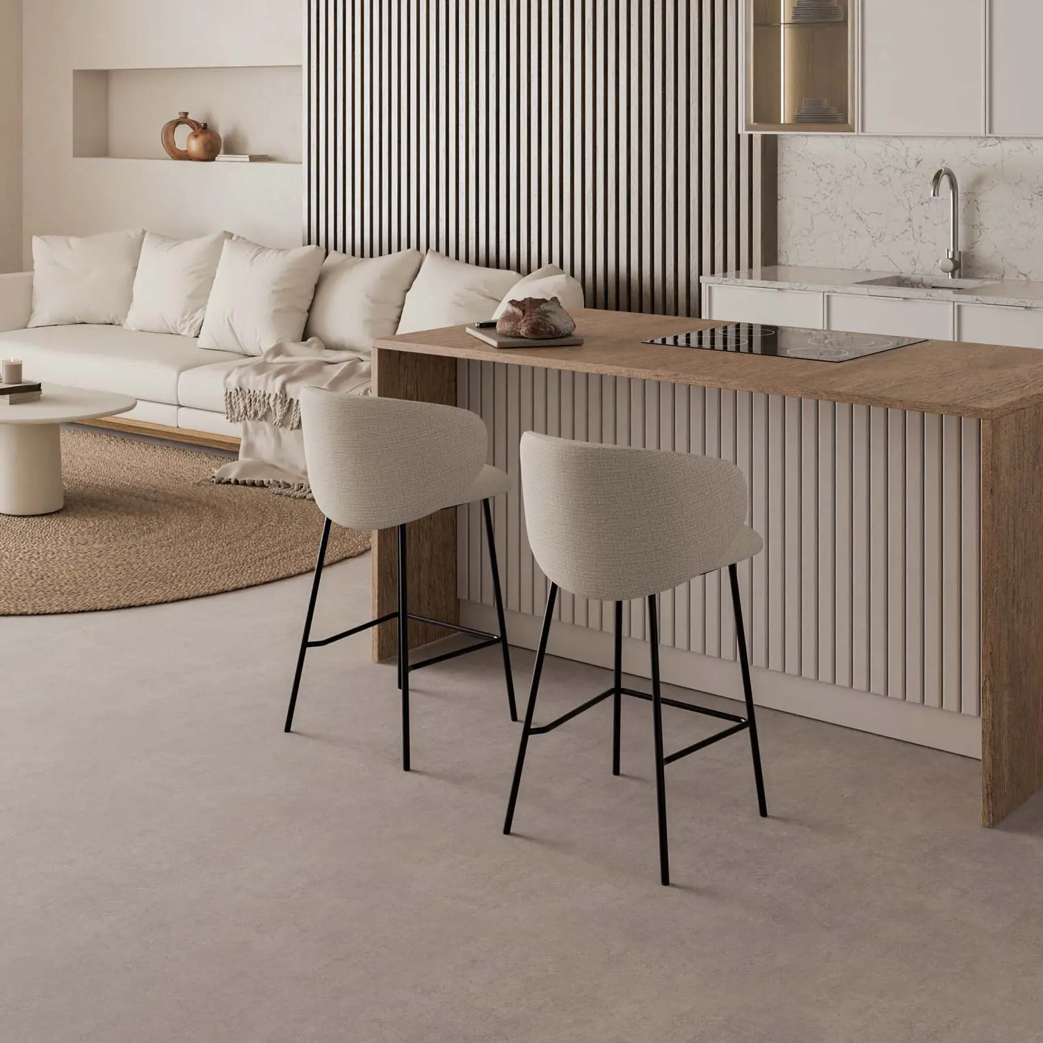 Añade un toque de elegancia sin renunciar a la comodidad con el taburete bajo RAY. Esta pieza destaca por su diseño moderno y funcionalidad. Su respaldo alto y ergonómico proporciona un excelente soporte para la espalda, mientras que el asiento acolchado ofrece un confort adicional, convirtiendo al taburete RAY en la opción ideal para cocinas, bares o áreas de descanso. El reposapiés integrado no solo mejora la estabilidad del taburete, sino que también ofrece un lugar cómodo para descansar los pies. El tejido en color beige, confeccionado en 100% poliéster, aporta un aspecto sofisticado y elegante.